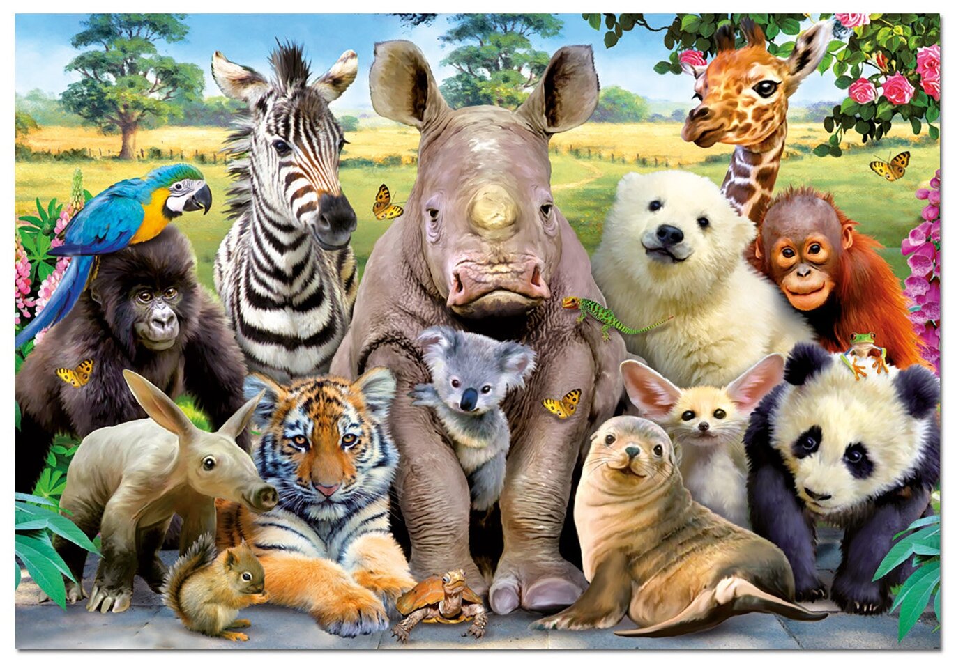 Пазл «Классное фото» с изображением диких животных на фоне красивой природы. Тут есть обезьяны, зебра, бегемот, жираф, панда, тигр, черепаха и другие. Размер 68 х 48 см.