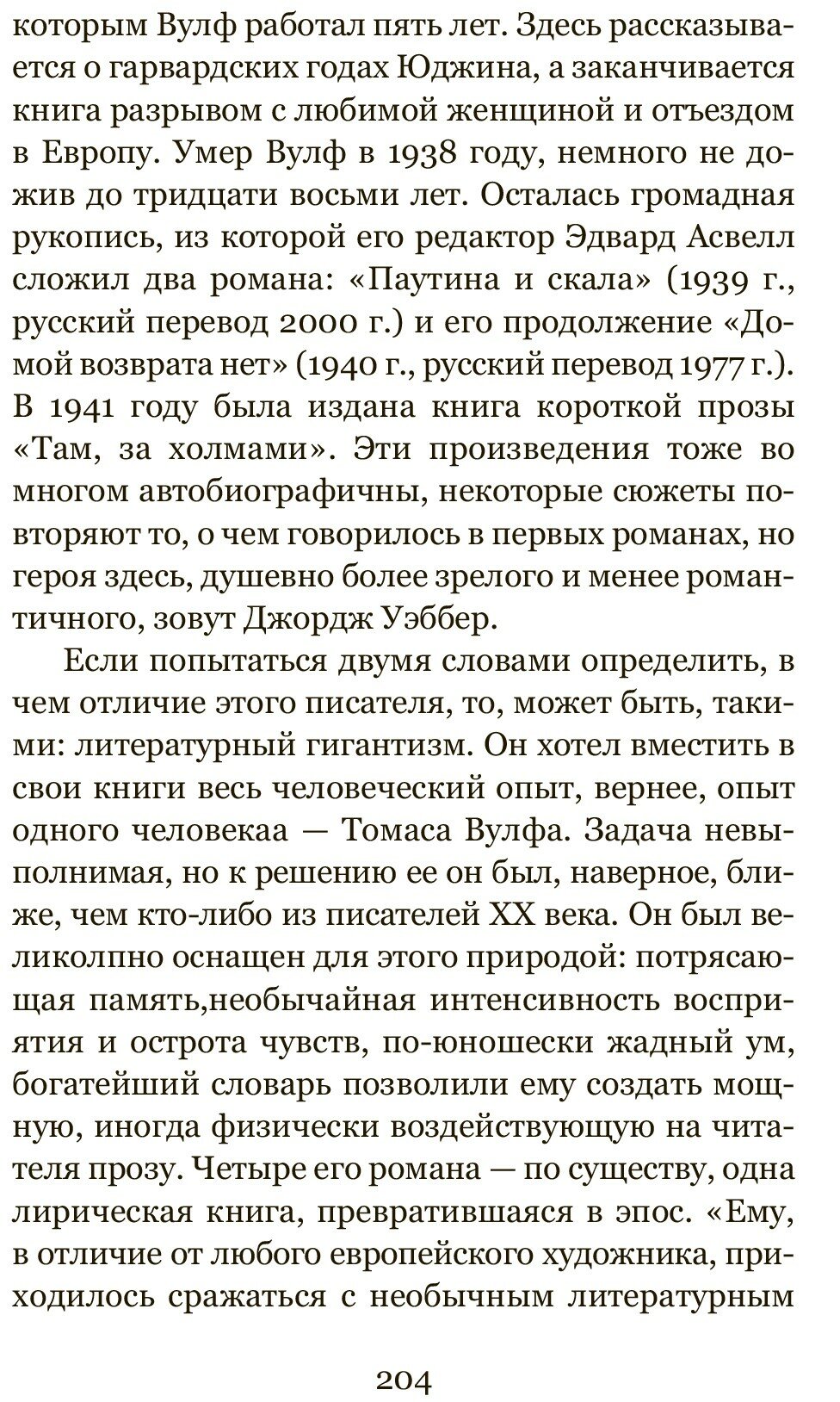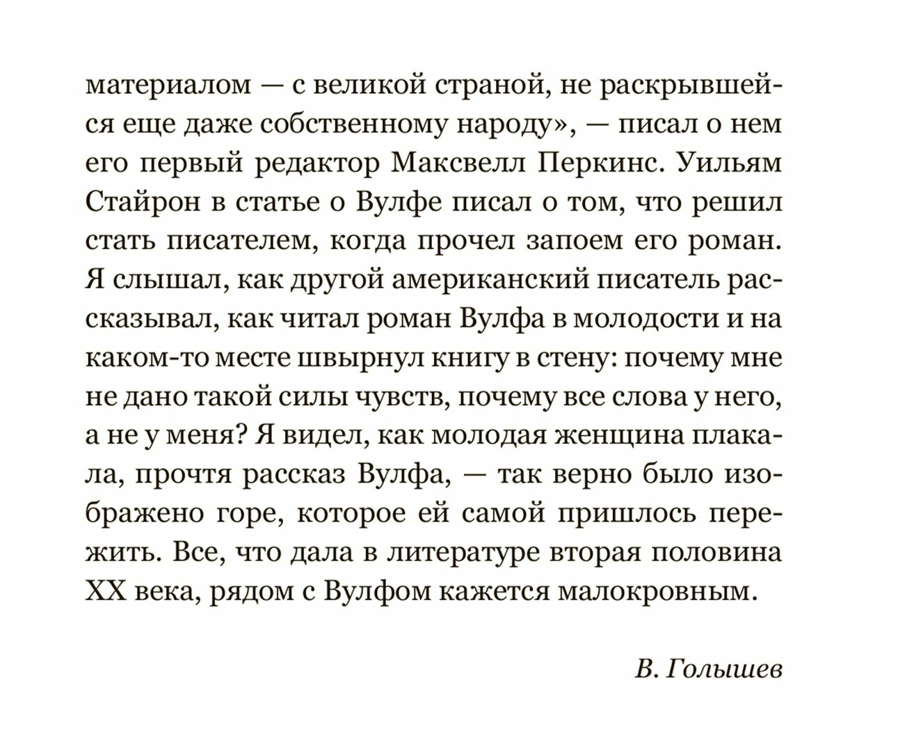 "Если попытаться двумя словами определить, в чем отличие этого писателя, то, может быть, такими: литературный гигантизм. Он хотел вместить в свои книги весь человеческий опыт, вернее, опыт одного человека - Томаса Вулфа. Задача невыполнимая, но к решению ее он был, наверное, ближе, чем кто-либо из писателей XX века… Все, что дала в литературе вторая половина XX века, рядом с Вулфом кажется малокровным…" (В. Голышев)
