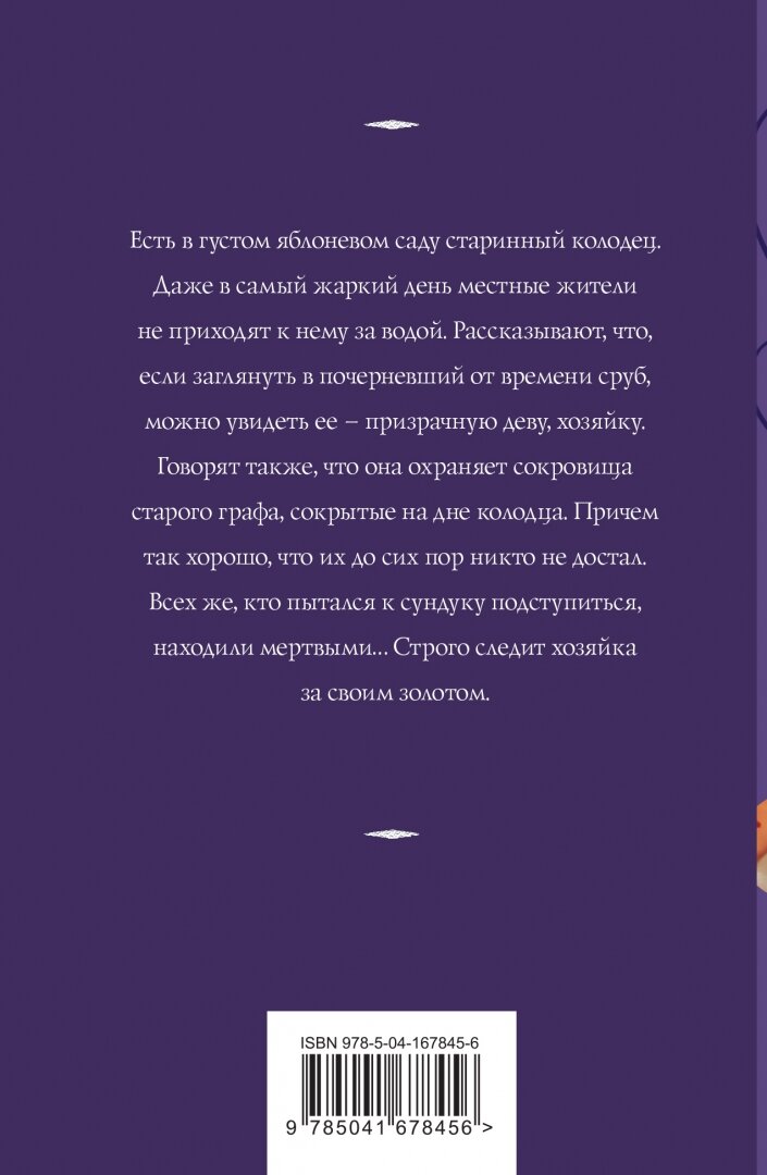 Есть в густом яблоневом саду старинный колодец. Даже в самый жаркий день местные жители не приходят к нему за водой. Рассказывают, что, если заглянуть в почерневший от времени сруб, можно увидеть ее - призрачную деву, хозяйку. Говорят также, что она охраняет сокровища старого графа, сокрытые на дне колодца. Причем так хорошо, что их до сих пор никто не достал. Всех же, кто пытался к сундуку подступиться, находили мертвыми… Строго следит хозяйка за своим золотом.