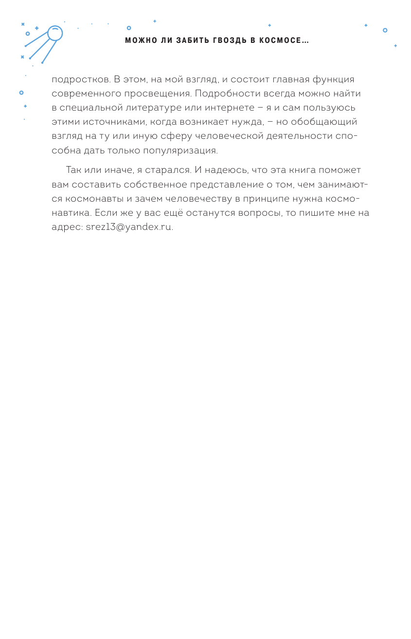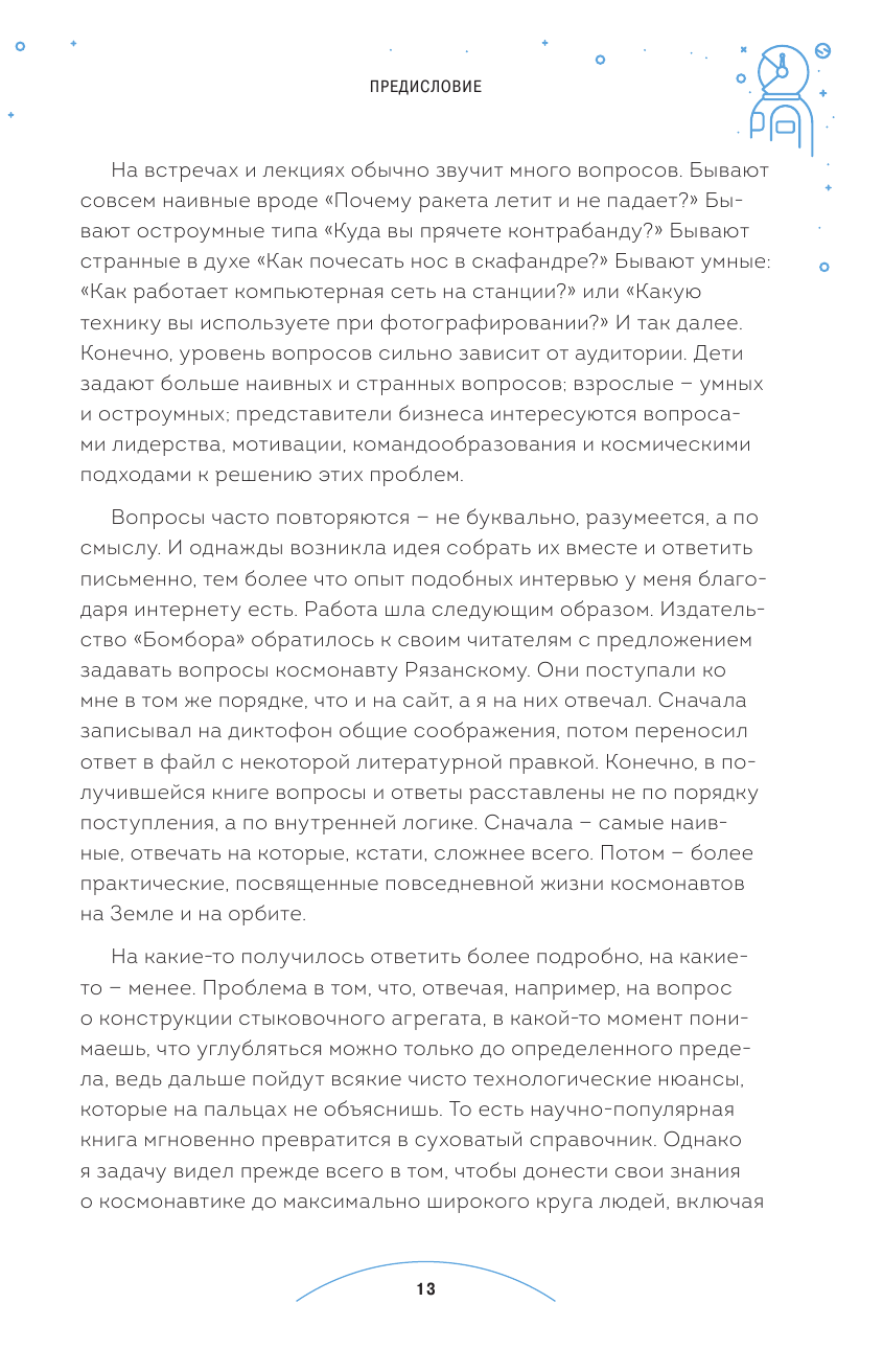 Прекрасная книга космонавта Сергея Рязанского полезна прежде всего для школьников. Написана в занимательной форме и даёт ответы на многие вопросы живым, доступным языком. Предназначена тем, кто увлекается космонавтикой. Замечательны содержание и форма. Возникает ощущение открытого диалога с космонавтом. А вот качество и размер фото и иллюстраций оставляет желать лучшего. Книга интересна и педагогам, которые ведут занятия по космонавтике и учителям физики. Можно составить викторины и найти темы для проектов с учениками. Большое спасибо за книгу! Давно ждали такую умную книгу!