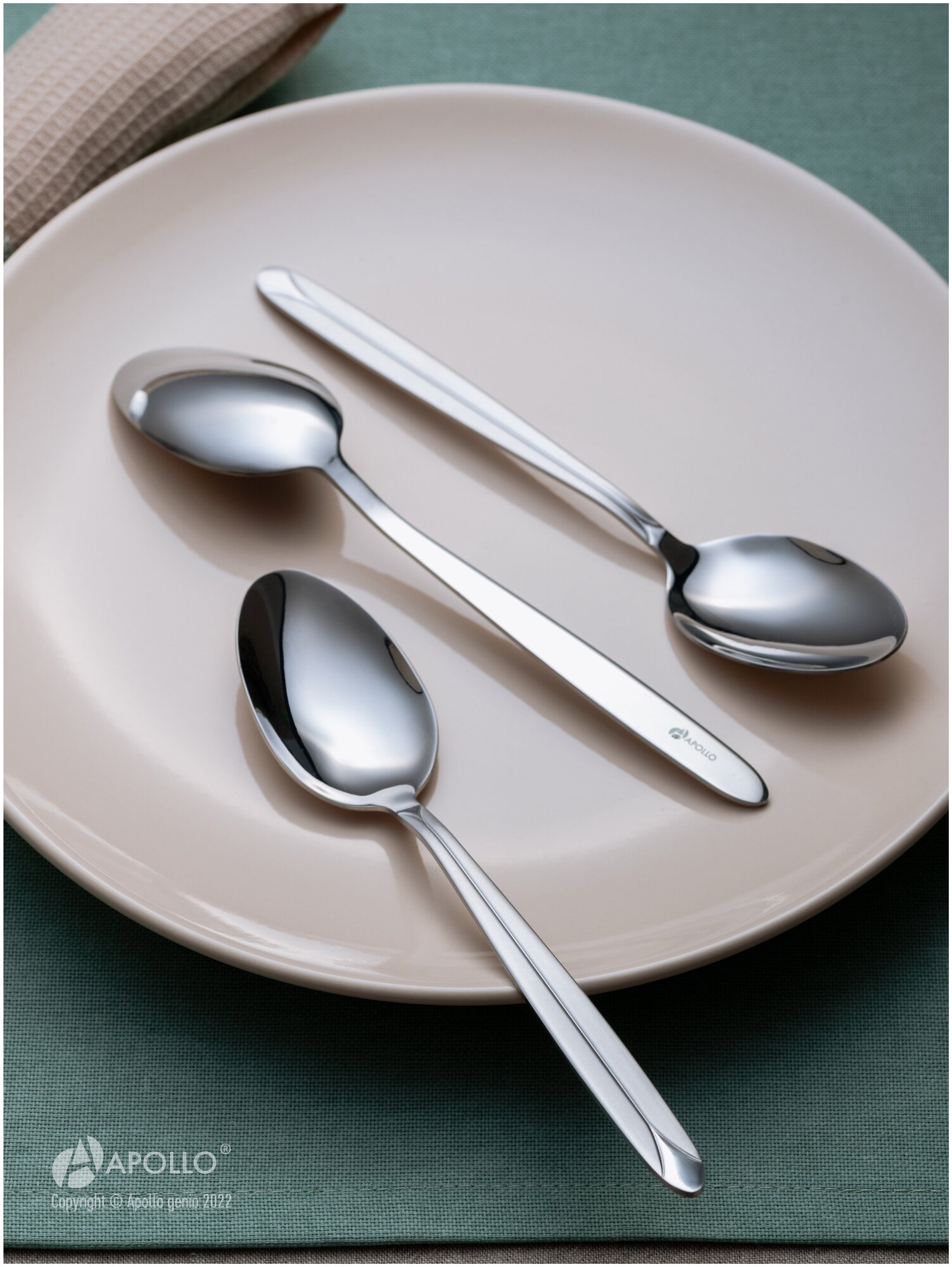 Набор ложек отлично впишется в общую картину обеденного стола! Ложки столовые оснащены длинной, удобной ручко. Дизайнерская форма ложки имеет серебряный цвет. Выполненные из прочной нержавеющей стали, приборы не чернеют и остаются блестящими достаточно долго. Эстетичная серия приборов не оставит вас равнодушными. При сервировке ложки отлично смотрятся на фоне фарфора. Также ложки могут быть использованы в качестве десертных. Вы можете использовать набор в процессе приготовления различных блюд. Например, перемешивание салата или супа. С красивой ложкой еда станет намного вкуснее и родные будут наслаждаться. Вы также можете дополнить кухонную утварь нашими моно-наборами из серии. Такой набор станет оличным подарком маме, бабушке, сестре или подруге. Наше покрытие ничем не отличается от мельхиора - ложки такие же блестящие! Ложки могут использоваться как мерные - вмещают до 15 мл. В отличие от деревянных ложек, комплект прослужит много лет. Использование одноразовой посуды не экологично. Маленькие шаги помогают планете. Изящный и лаконичный, набор ложек станет незаменимым для декора обеденного стола. Комплект подойдет под интерьер любой кухни. Рекомендуется ручная мойка с использованием щадящих чистящих средств. Хранение предусмотрено в сухом месте. Внедряй в свою жизнь интересные решения! Создавай домашний уют вместе с APOLLO genio!