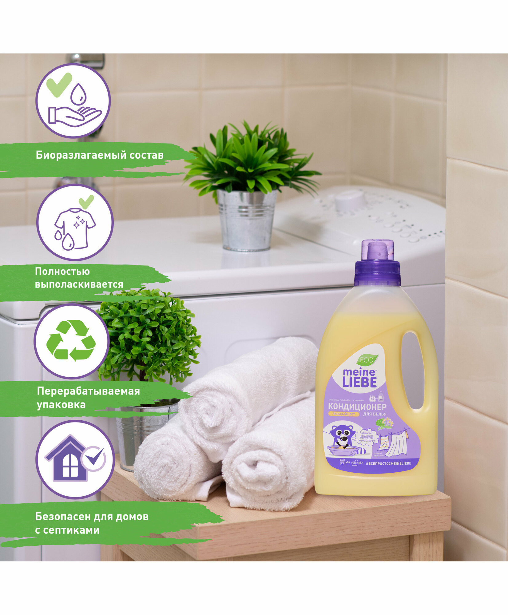 Кондиционер Meine Liebe Липовый цвет для белья концентрат смягчает волокна ткани благодаря содержанию в составе активных ингредиентов на основе натуральных веществ. Облегчает глажение, придает антистатический эффект, сохраняет цвет и структуру волокон. Быстро и без остатка выполаскивается с ткани. Вещи, постиранные с применением кондиционера для белья, сохнут быстрее, так как в волокнах ткани задерживается меньшее количество воды. Подходит для всех типов тканей, для машинной и ручной стирки.