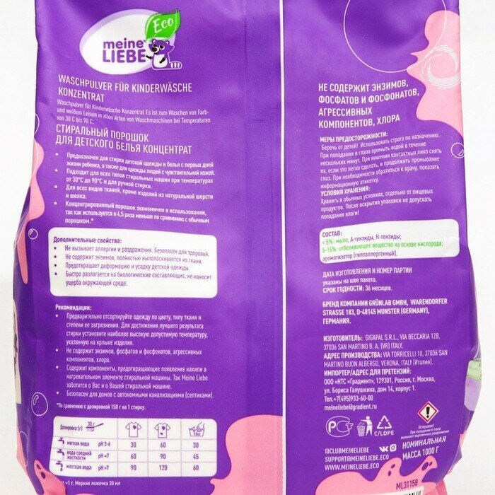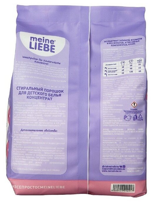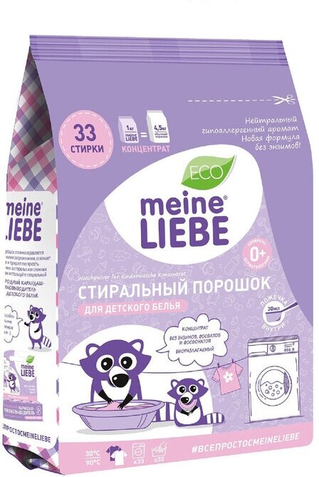 Стиральный порошок Meine Liebe для детского белья предназначен для стирки детской одежды и белья с первых дней жизни ребенка, а также для одежды людей с чувствительной кожей. Подходит для всех типов стиральных машин и для ручной стирки. Не содержит энзимов и полностью выполаскивается из тканей. Концентрированный порошок экономичен в использовании, так как используется в 4,5 раза меньше по сравнению с обычным порошком. Для всех видов тканей, кроме изделий из шерсти и шелка.