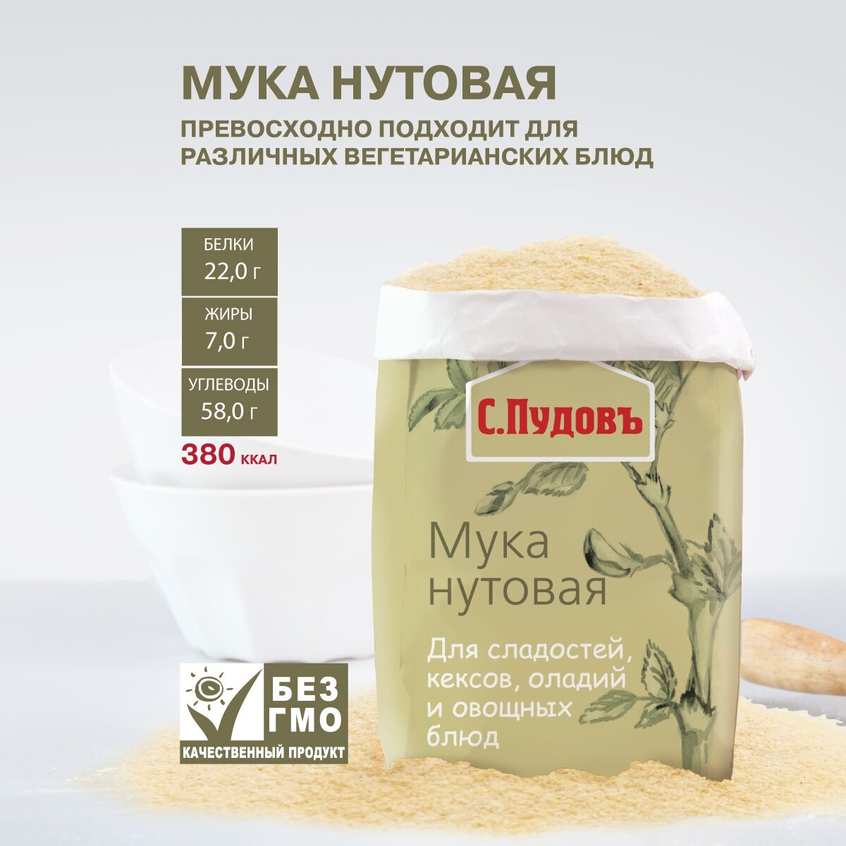 Нутовая мука «С. Пудовъ» - настоящий супер-фуд и находка для заботливых хозяек.По своей пользе нутовая мука (её ещё называют бесан) – безусловный лидер среди редких видов муки по содержанию полезных для организма веществ и микроэлементов.Перечислять их можно бесконечно.Отметим лишь, что нутовая мука богата растительным белком, клетчаткой, а также полиненасыщенными и мононенасыщенными жирными кислотами (омега-3, омега-6, омега-9).Нутовую муку мелкого помола «С. Пудовъ» рекомендуют добавлять в разные виды выпечки, например, кексы, сырники, оладьи и т. д. Из нутовой муки многие хозяйки готовят сладости по рецептам правильного питания.А еще она служит полезной добавкой для вегетарианских блюд.Нутовая мука имеет приятный ореховый привкус с легким карамельным оттенком.Невероятно вкусно, а главное – очень полезно!Состав: мука нутовая. Без ГМО.Пищевая ценность в 100 г готового продукта: белки - 22,0 г, жиры - 7,0 г, углеводы - 58,0 г.Энергетическая ценность: 1590 кДж, калорийность: 380 ккал.Срок годности: 12 месяцевХранить при температуре +20±5С и относительной влажности воздуха не более 70%.