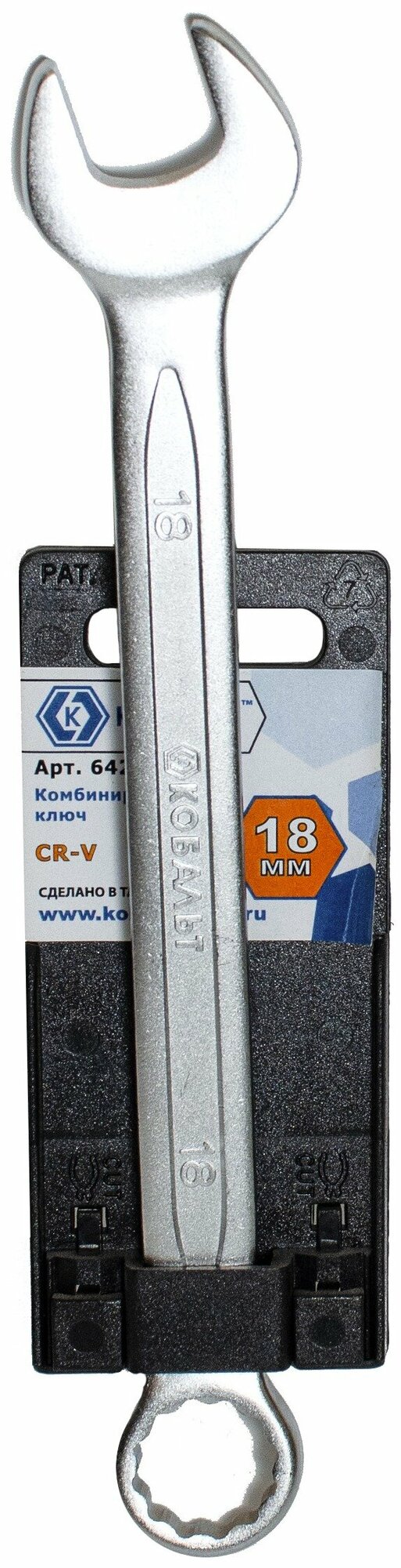 Ключ комбинированный кобальт 18 мм изготовлен из хромванадиевой инструментальной стали, которая обеспечивает большую прочность и износостойкость. Комбинированная форма ключа позволяет с помощью рожкового ключа с одной стороны иметь доступ сбоку к головке болта, и с помощью накидного ключа с 12 гранями обеспечить лучший захват граней болта для работы с высоким крутящим моментом. Специальная обработка поверхности ключа обеспечивает удобный захват и комфортную работу.Характеристики: Тип: рожково-накидной Длина (мм): 220 мм Размер ключа: 18 мм Материал ключа: Cr-V сталь Покрытие ключа: хромированное