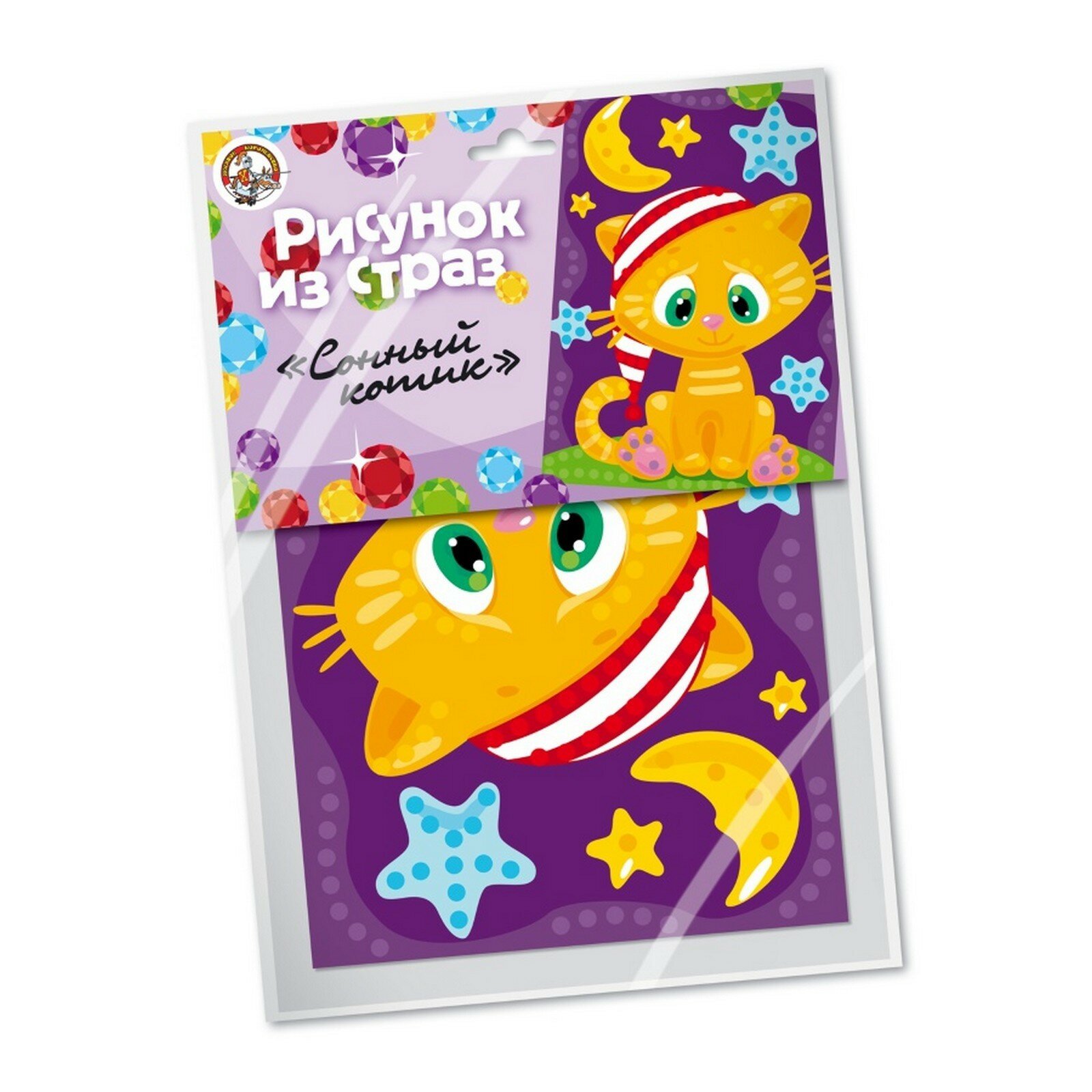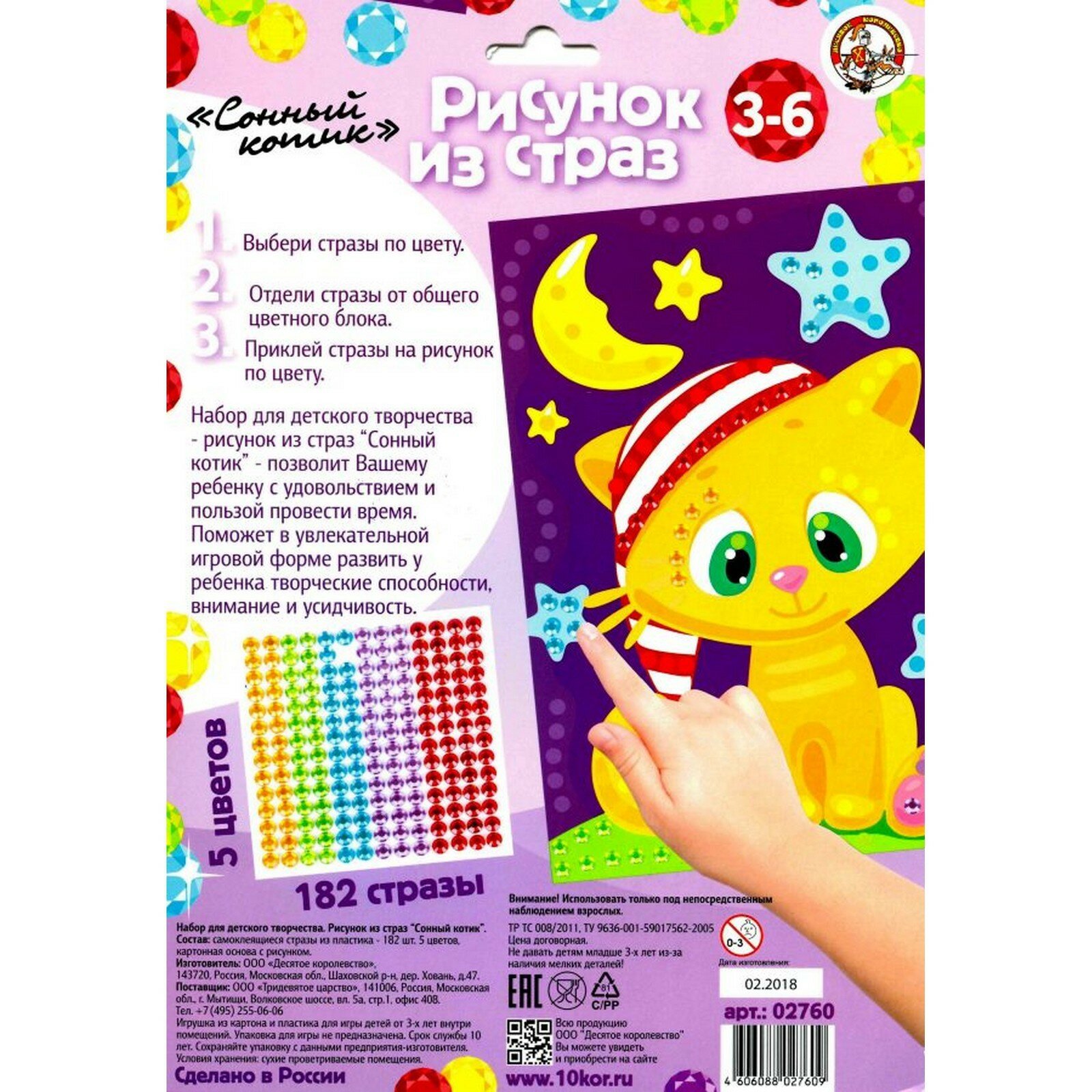 | Состав набора | картонная основа с рисунком,самоклеящиеся стразы из пластика (диаметр 5 мм, 5 цветов) - 182 шт |