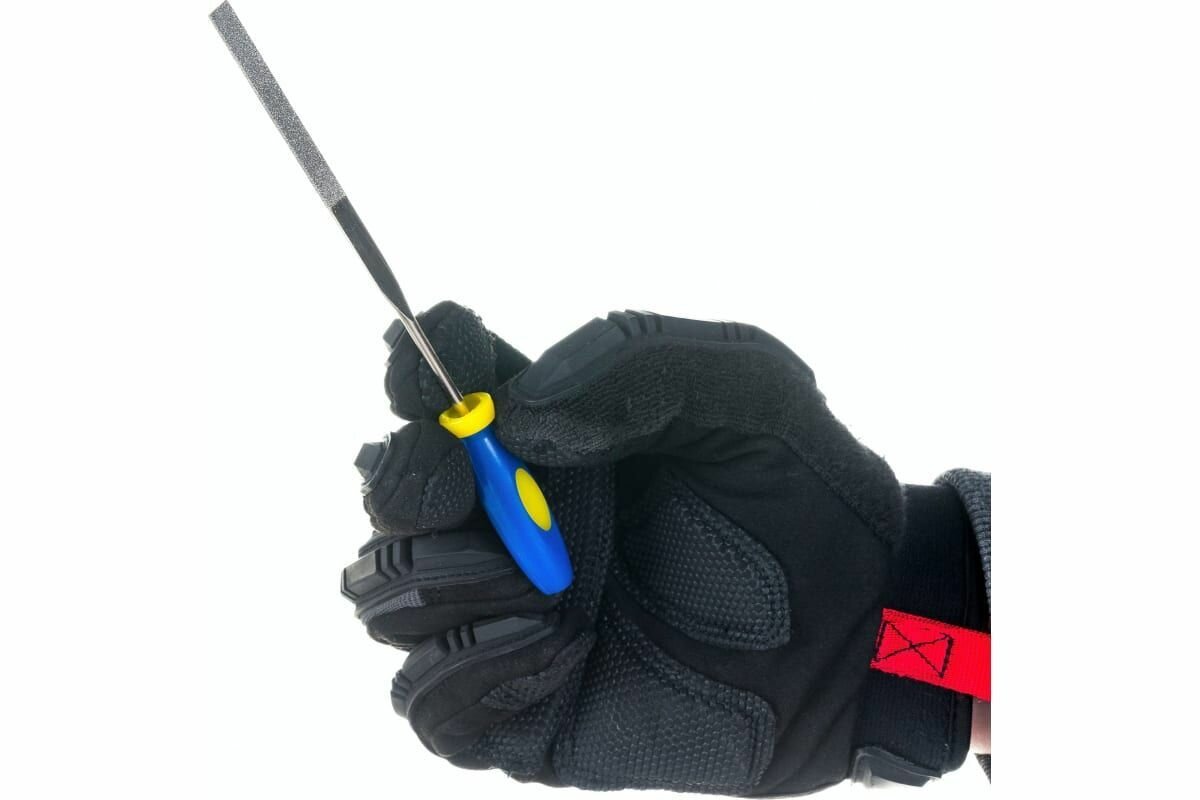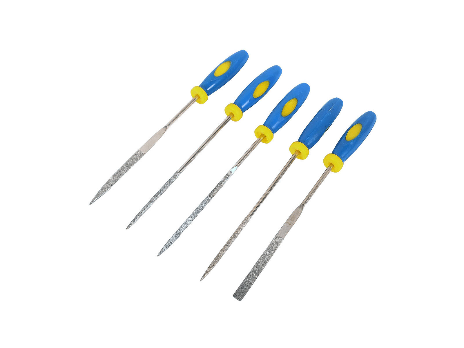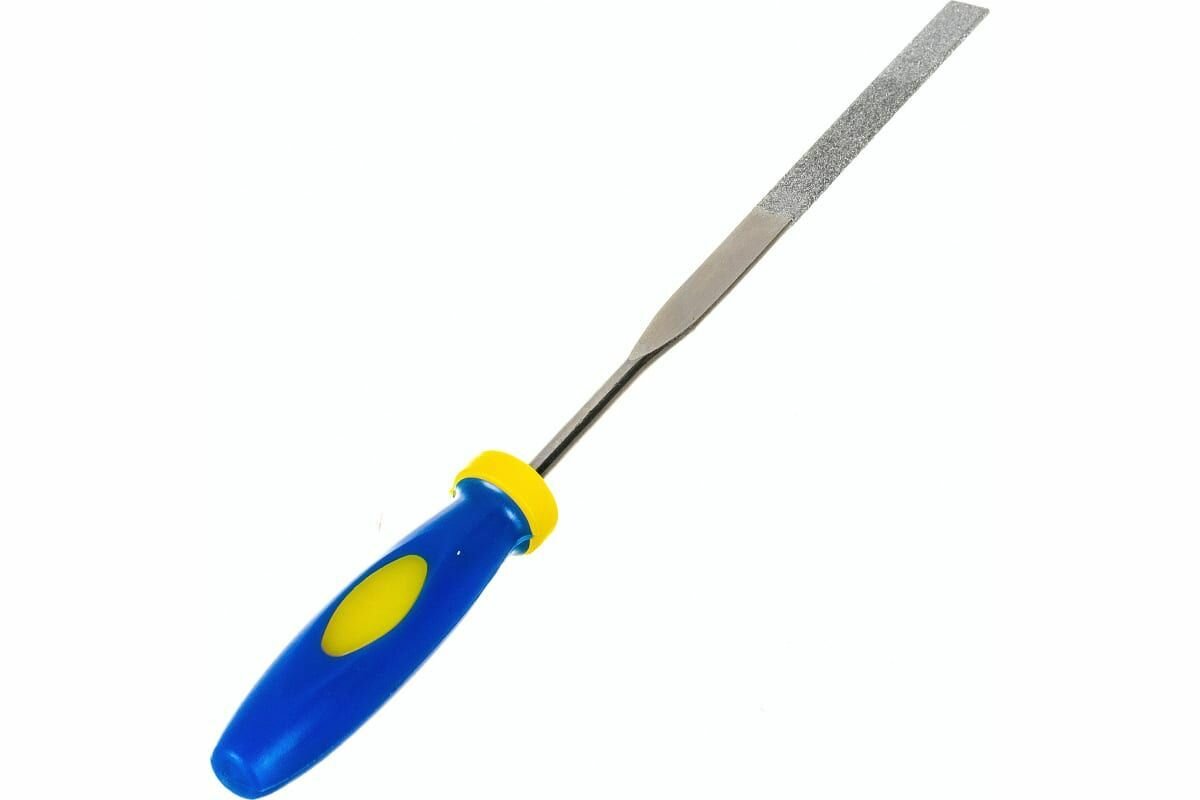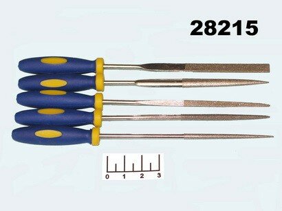Профессиональное применение. Набор узких алмазных надфилей (5 шт.) Материал: жало из легированной стали с алмазным напылением, пластиковая прорезиненная ручка. Упаковка: блистер.