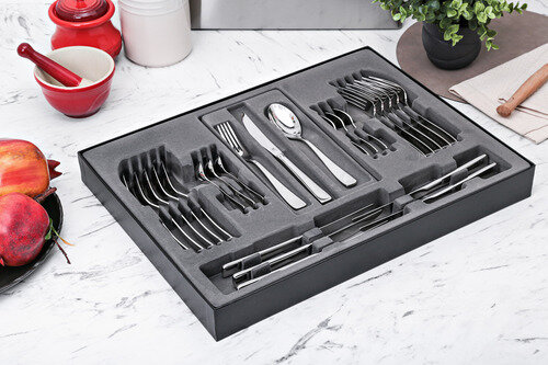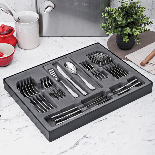 | Состав набора | ложка столовая — 6 шт; вилка столовая — 6 шт; нож столовый — 6 шт; ложка чайная — 6 шт; вилка десертная — 6 шт |
