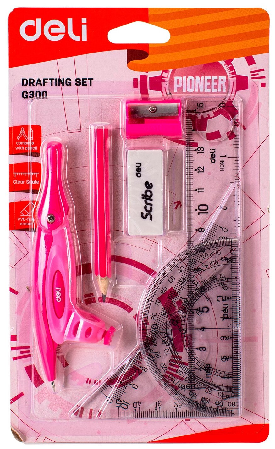 Набор для чертежей Deli пластик в компл.:линейка/транспортир/2 угольника/карандаш/ластик/точ 24 шт./кор. EG30001