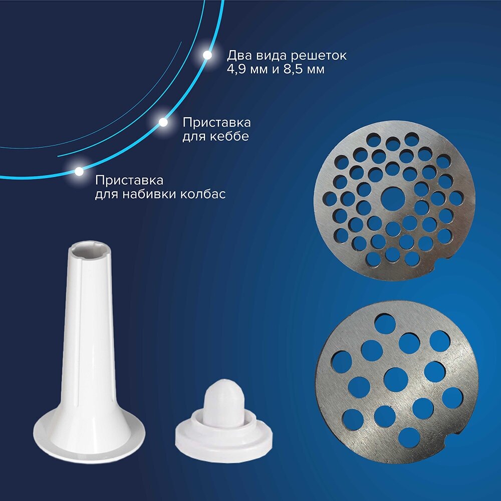 | Прочие особенности и свойства | До 30 минут непрерывной работы; 2 вида решеток для получения фарша разной консистенции - с диаметром отверстий 4,9 мм и 8,5 мм; |