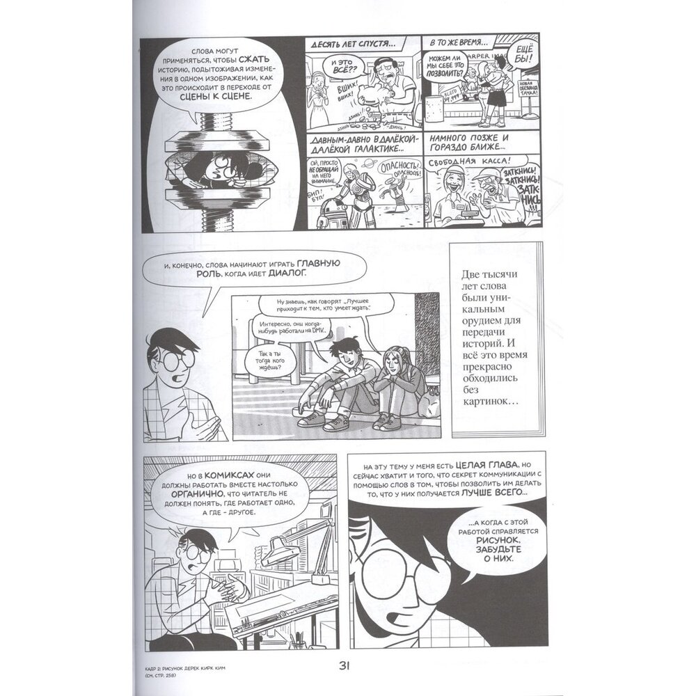В своем неповторимом стиле Макклауд подробно и наглядно объясняет не только процесс создания комикса, но и делится профессиональными секретами (как вести взглядом читателя, как работать с перспективой, что такое язык тела и как найти баланс между словами и изображениями). Эта книга будет интересна не только тем, кто хочет научиться делать комиксы, но и геймдизайнерам, мультипликаторам и многим другим, чья задача - рассказывать увлекательные истории читателю.