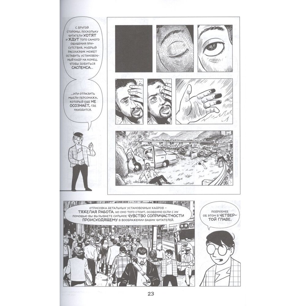 Третья книга Скотта Макклауда о комиксах и их особенностях. Впрочем, если в "Понимании комикса" Скотт прежде всего доказывал то, что комикс - это отдельный вид искусства, а в "Переосмыслении комикса" рассматривал, какими путями комиксы могут развиваться в будущем, то в этой книге Скотт пишет о комиксах с утилитарной точки зрения - как их делать. Здесь он дает советы и как сценарист, и как художник. Книга, как и две предыдущие, выполнена в формате комикса, но на этот раз есть гигантские текстовые вставки. Из минусов должен отметить работу корректора ("карьера длиННой в век" и "недоставать" - перлы, выявленные мной чуть ли не на первой странице). В целом, книги Макклауда - чуть ли не единственное, что посвящено комиксам, их особенностям и созданию ("Комиксы и последовательное искусство" Айснера не перевели, а Ли пишет немного о другом), так что горячо рекомендую!