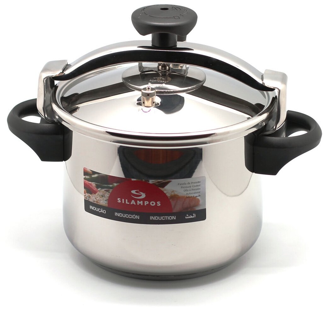 Скороварка из нержавеющей стали объемом 4,5 л. от компании Silampos. Выполнена в современном полированном корпусе из нержавеющей стали 18/10 и имеет толстое трехслойное дно, благодаря чему может быть использована на всех типах плит, включая индукционные. Бакелитовые ручки корпуса и крышки очень прочны. Вставка-сито позволяет готовить на пару. Подходит для мытья в посудомоечной машине.
