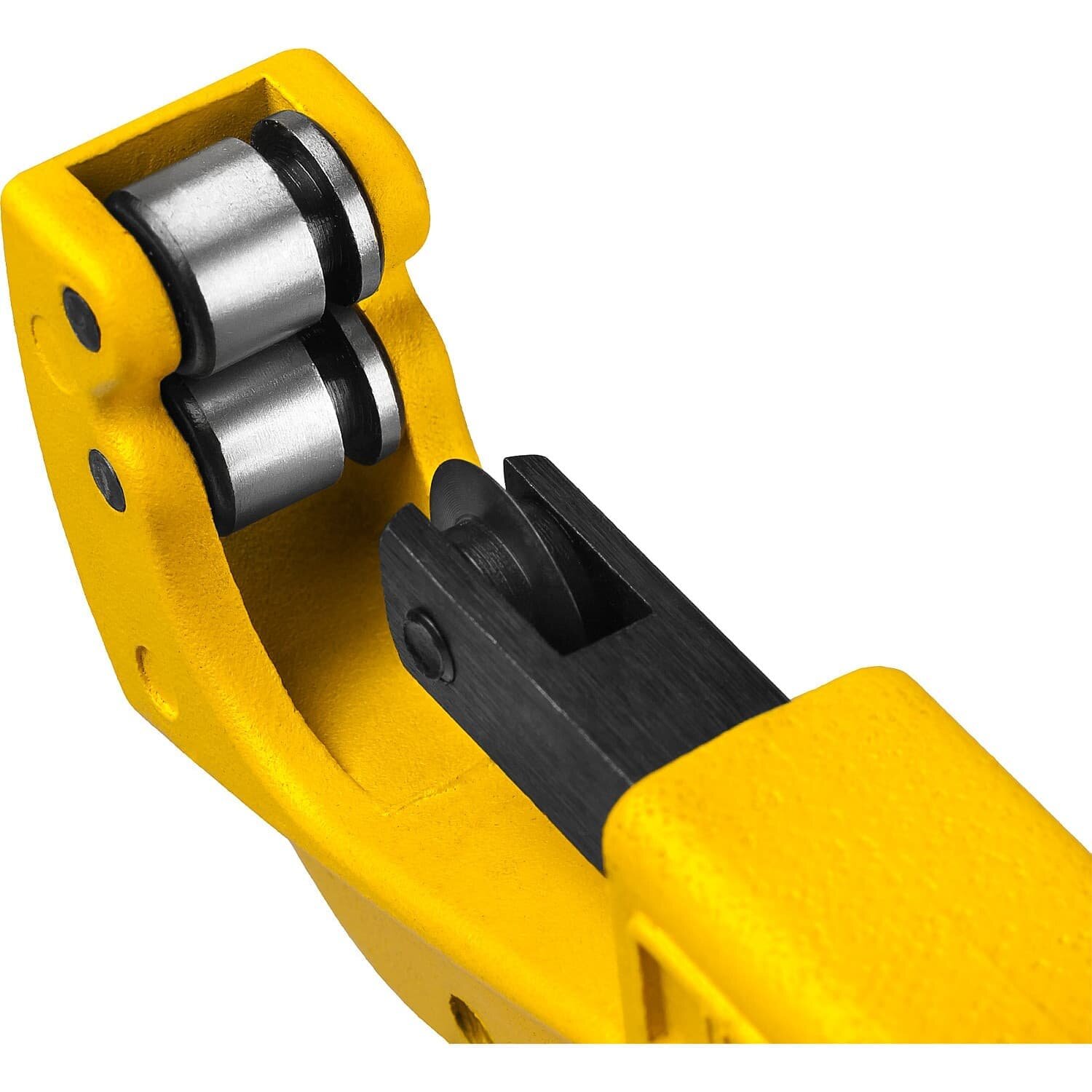 Профессиональный труборез для труб из цветных металлов.Режущий элемент изготовлен из инструментальной стали 2 полированных ролика с проточками для фиксации развальцованных труб надежно фиксируют трубу при резке Встроенный нож для снятия фаски.