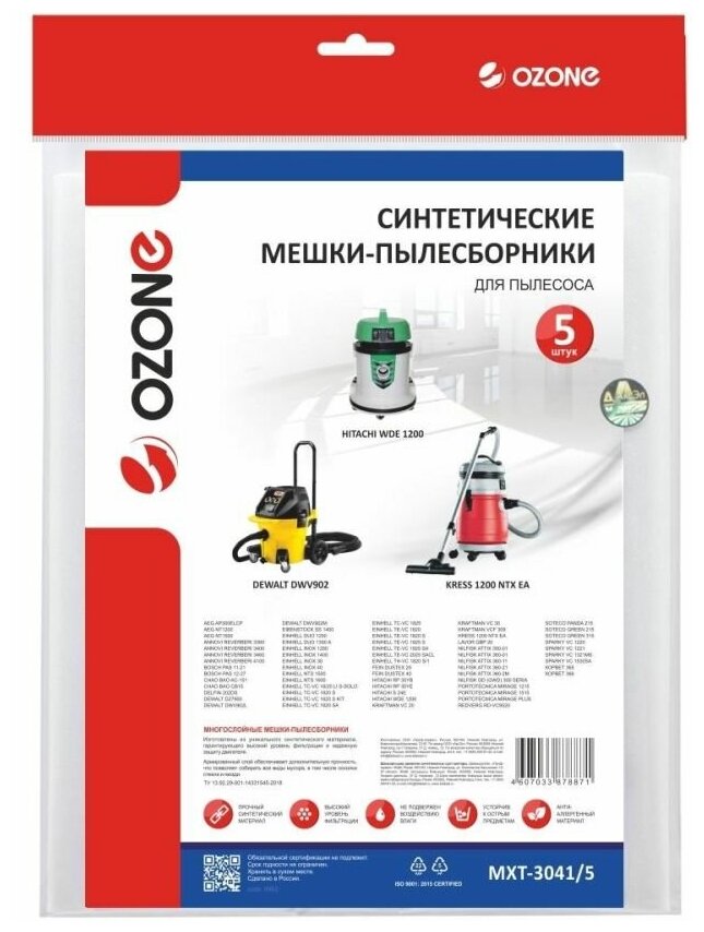 Мешки для пылесоса 5шт KRESS 1200 NTX EA, HITACHI WDE 1200, AEG, BOSCH, DEWALT, NILFISK, PORTOTECNICA, SOTECO, SPARKY. Синтетические мешки-пылесборники OZONE предназначены для установки в профессиональные пылесосы. Изготавливаются из уникального антиаллергенного материала МИКРОПОР.