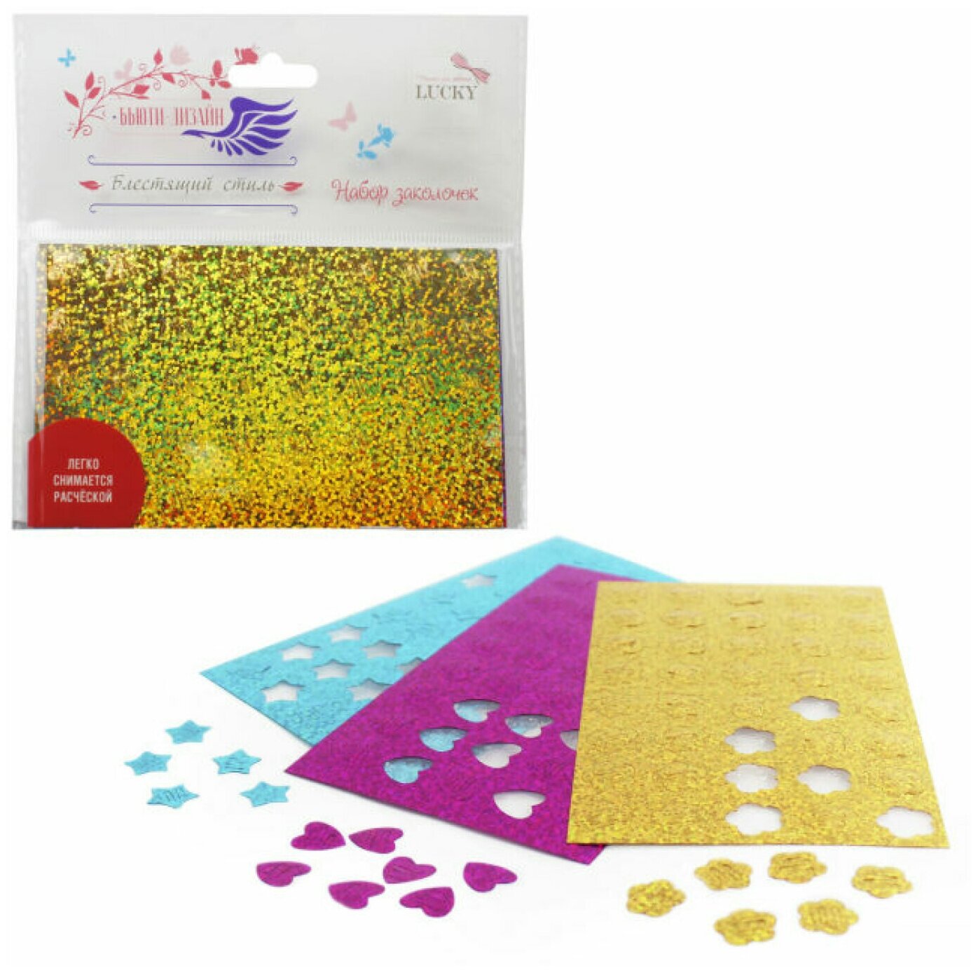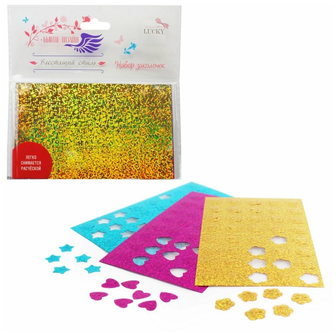 Набор блестящих ярких заколочек для использования совместно с Набором для декорирования причесок мини-заколками Бьюти-Дизайн Блестящий стиль Lucky позволит преобразить причёску за 5 минут! Девочка сможет создать легко и быстро украсить волосы необычными блестящими мини-заколками.