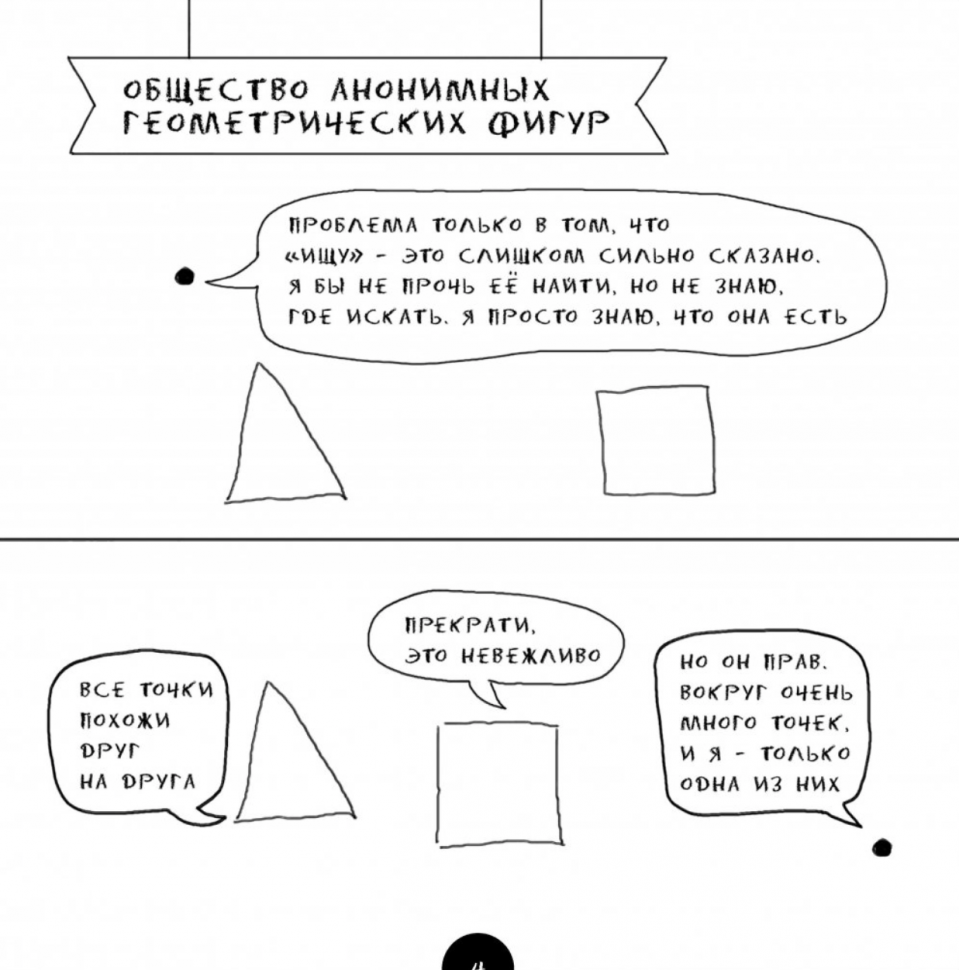 Помните, как пелось в одной старой песне? "Кто-то теряет, кто-то находит". Согласитесь, всё точно как в учебнике по геометрии - точка А ищет точку В, треугольник ищет своё основание, а луч ищет своё начало. Кто-то теряет, кто-то находит, кто-то всю жизнь пребывает в поисках. Для одной фигуры ты всего лишь невзрачная точка, а для другой - полноценный центр. "Точка А" - это история как раз о таких фигурах, у которых всё как у людей. Или о людях, у которых всё как в учебниках по геометрии.