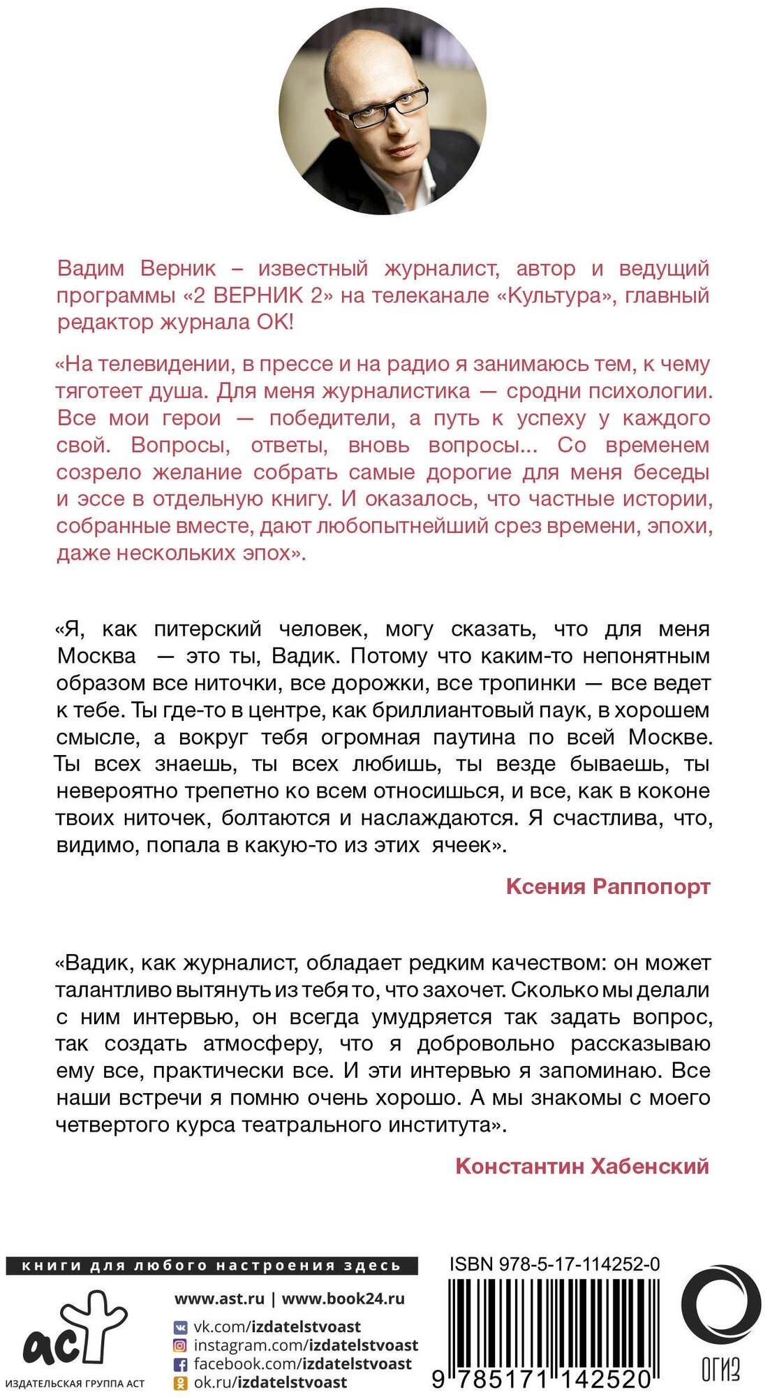 Вадим Верник – известный журналист, автор и ведущий программы "2 верник 2" на телеканале "Культура", главный редактор журнала ОК! "На телевидении, в прессе и на радио я занимаюсь тем, к чему тяготеет душа. Для меня журналистика — сродни психологии. Все мои герои — победители, а путь к успеху у каждого свой. Вопросы, ответы, вновь вопросы. Со временем созрело желание собрать самые дорогие для меня беседы и эссе в отдельную книгу. И оказалось, что частные истории, собранные вместе, дают любопытнейший срез времени, эпохи, даже нескольких эпох".