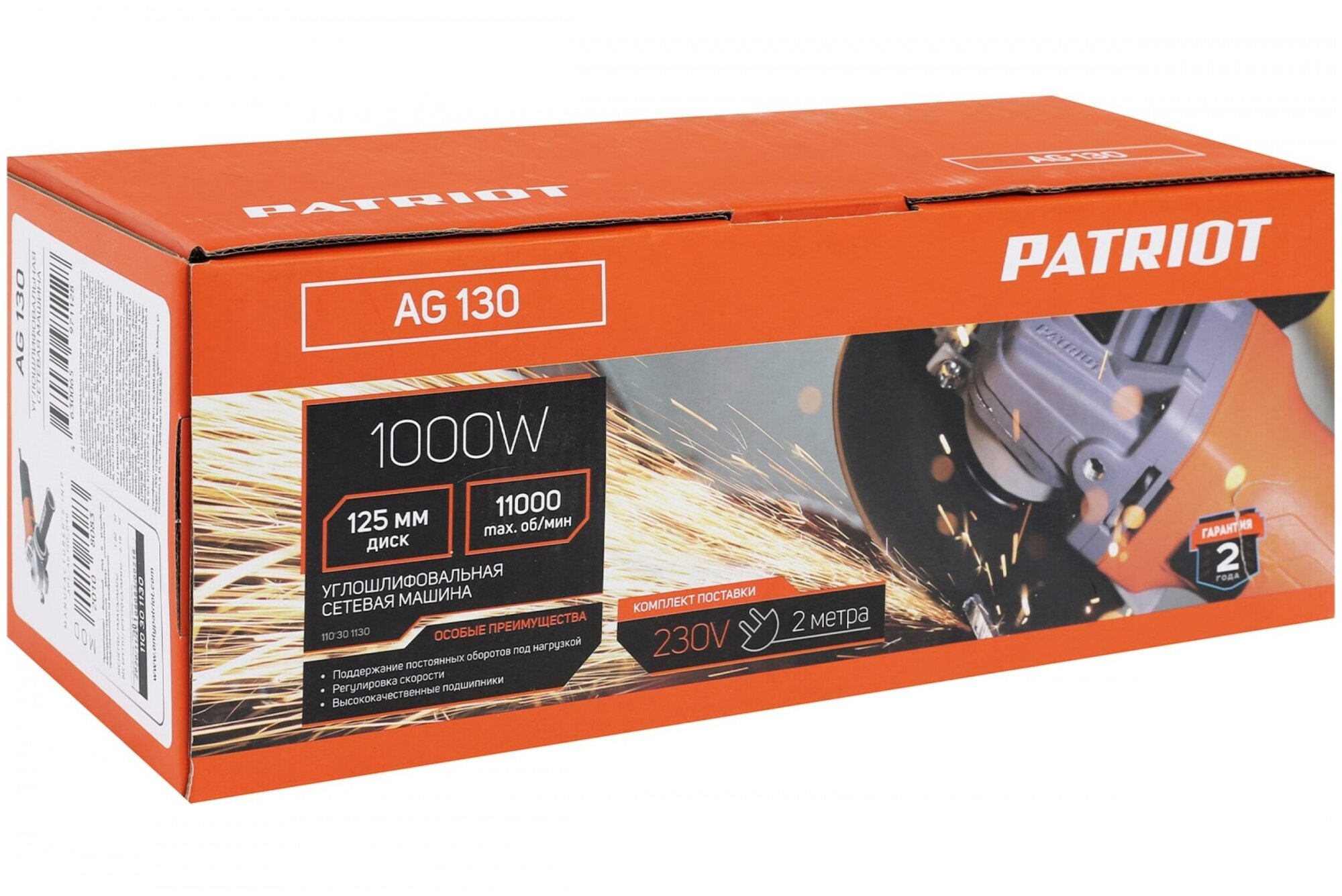 Угловая шлифмашина Patriot , мощность 1000Вт, диаметр шлифовального круга 125мм, скорость вращения до 11000об/мин (110301130)