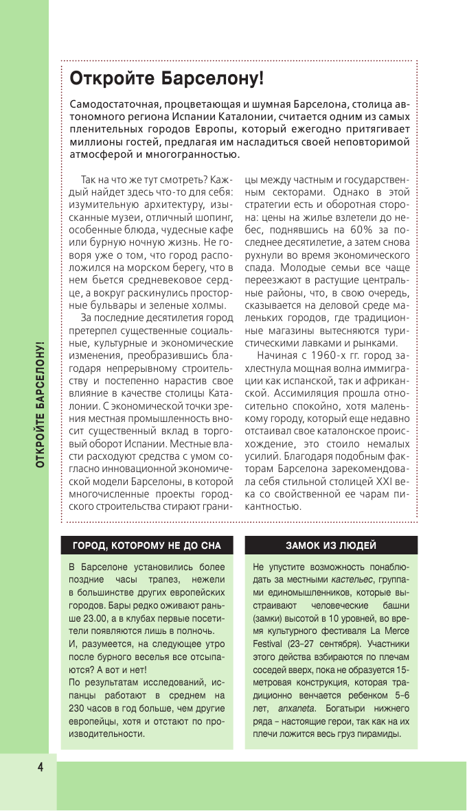 Перед вами экспресс-гид по Барселоне. В нем содержится краткая информация о столице, советы, как лучше провести первый и второй дни, и 25 главных достопримечательностей. Также в книге вы найдете описания самых интересных мест каждого района города. Гуляйте, знакомьтесь, восхищайтесь незабываемой Барселоной и получайте нужную информацию в режиме нон-стоп!