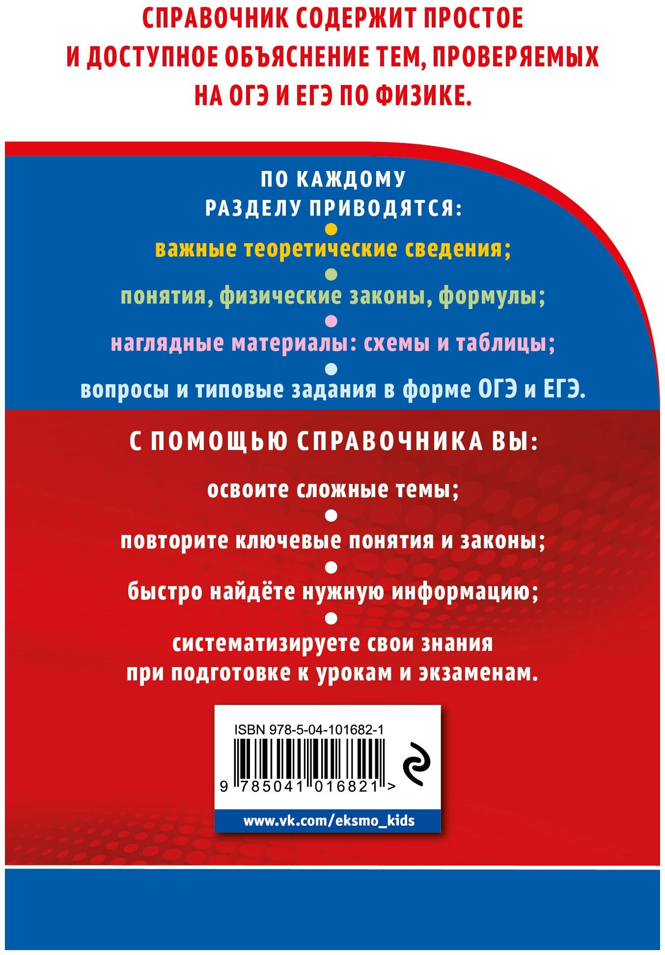 Справочник содержит сведения по всем темам, проверяемым на ОГЭ и ЕГЭ по физике. По каждому разделу приводится перечень необходимых понятий, физические законы, формулы, доступное объяснение тем, а также вопросы и типовые задания ОГЭ и ЕГЭ с ответами. Справочник поможет актуализировать знания для успешной сдачи экзаменов, а также подготовиться к различным формам текущего контроля в процессе изучения физики на уроках. Издание предназначено для учащихся 9 — 11 классов и учителей.