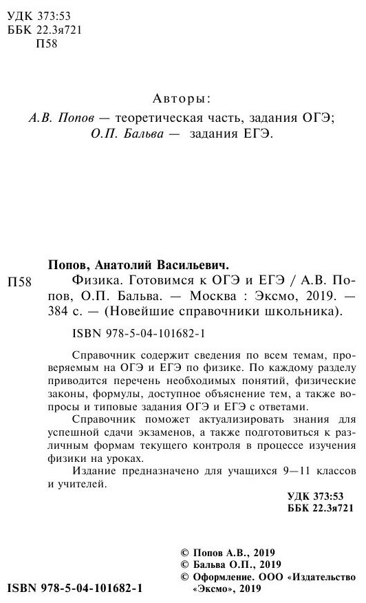 Физика. Готовимся к ОГЭ и ЕГЭ (Анатолий Васильевич Попов, Ольга Павловна Бальва); Эксмо, 2019