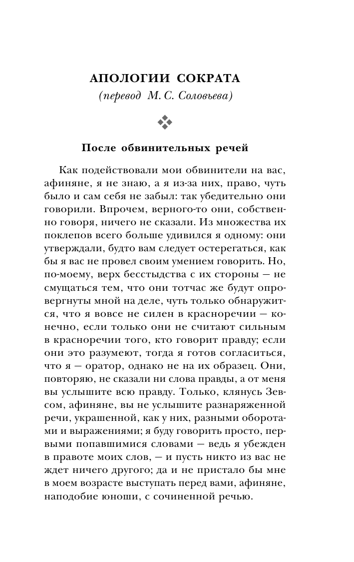 Могу лишь заранее предупредить, что в книге изложены мысли самого Платона, а не его непосредственного учителя, главного героя произведения Сократа. Потому не стоит думать, что всё, что говорит Сократ, он говорил в действительности. К примеру, точных подтверждений того, что Сократ верил в бессмертие души и её перерождение (диалоги "Федр" и "Федон") - нет.