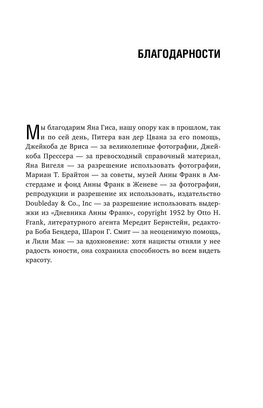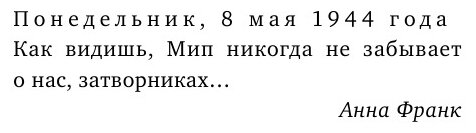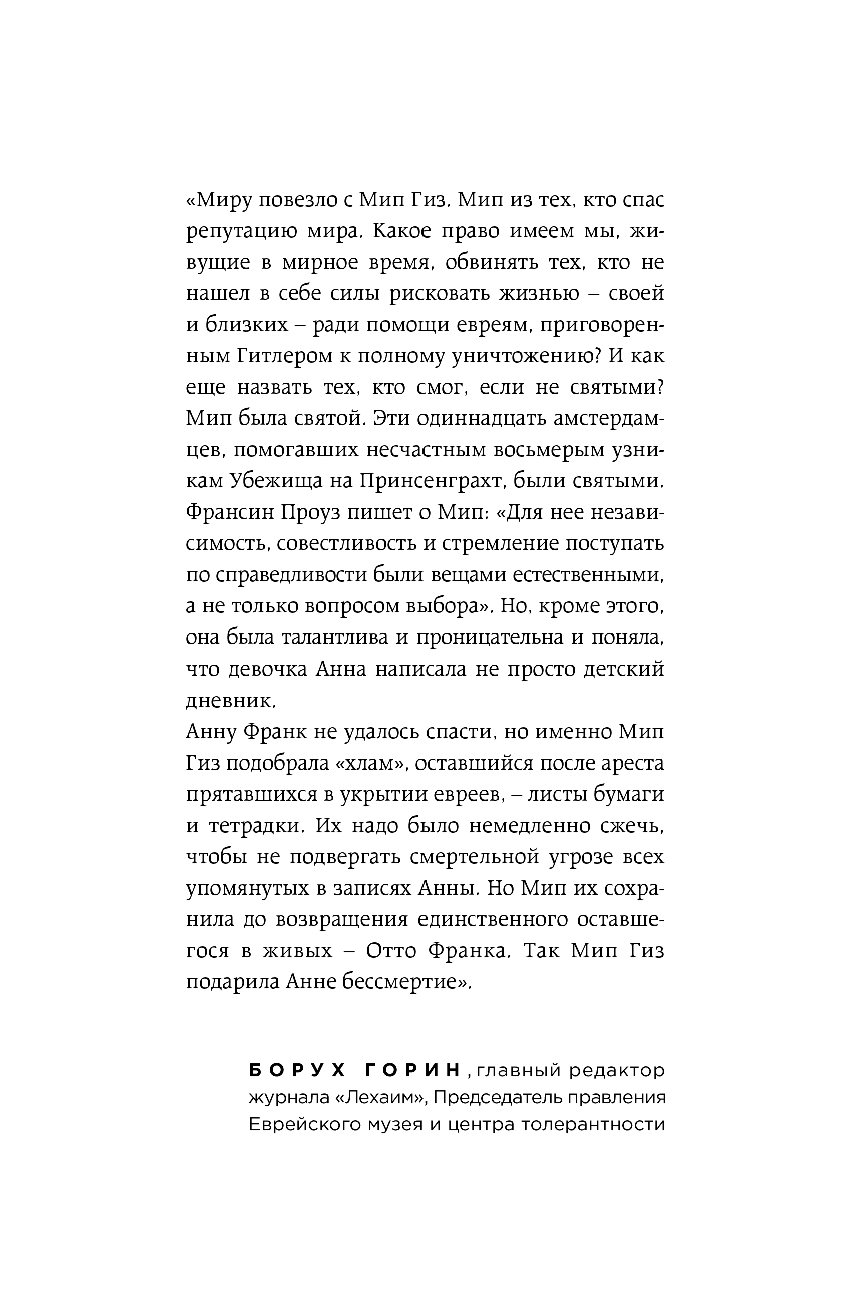 Дневник Анны Франк я прочитала еще в школе, и он вызвал у меня ураган чувств, забыть ту историю невозможно. Увидев уже знакомую девочку на обложке, решила прочитать и эту книгу, которая дает шанс увидеть историю Анны и ее семьи со стороны, глазами верной и храброй Мип. Такие люди, как Мип и ее муж поражают своей невероятной человечностью и силой духа. Невольно задумываешься, смогла бы ты так рисковать жизнью ради других? Книга написана довольно простым языком, без литературных изысков, но в этом ее сила: обычные люди, совершившие настоящий подвиг, без бахвальства рассказывают свою историю. Они и подвигом-то это не считают: сделали то, что должны. Таких книг в наше время хотелось бы больше.