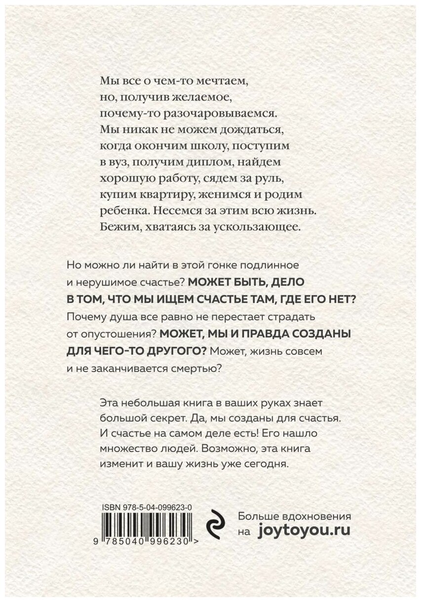 Почему, обретя желаемое, мы разочаровываемся? Почему то, о чем мы так долго мечтали, вдруг теряет свою ценность? Почему вновь и вновь нас захватывает пучина отчаяния, гордыня, стресс? Может быть, дело в том, что мы ищем счастье там, где его нет? Нам грезятся обманчивые миражи - успешная семья, работа, дети, секс, богатство, статус, карьера, власть, популярность, - достигнув которых, наша душа все равно не перестает страдать от опустошения. Как же быть? Вместо навязчивых инструкций по поиску спутника жизни, развитию личности и даже благотворительности, которые кому-то хоть как-то помогают наполнить проживаемые дни смыслом, автор этой книги предлагает факты, которые перевернули сознание многим людям, позволив обрести им Путь, Истину, Жизнь и настоящее Счастье, которое никогда не закончится и не потеряется.