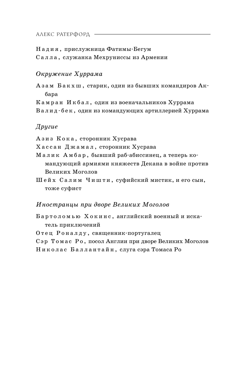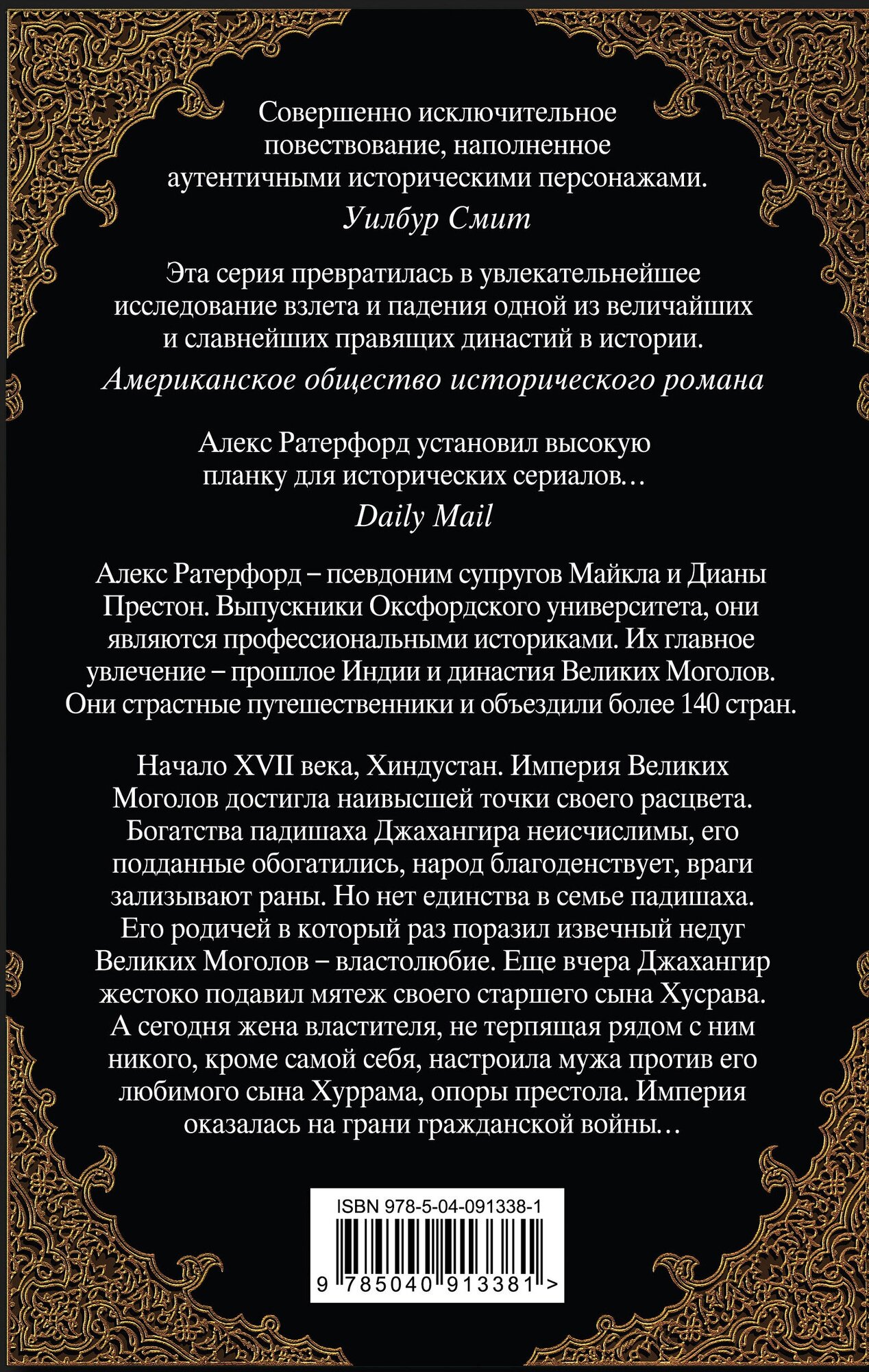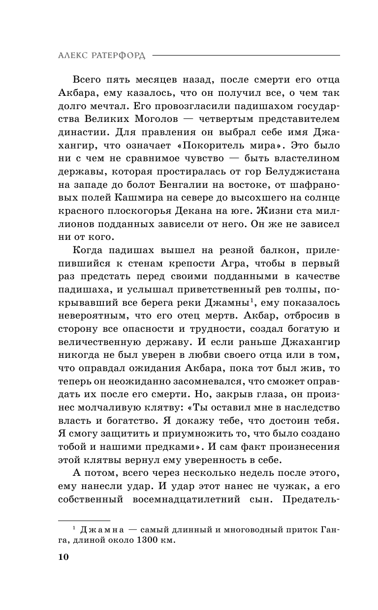 «Совершенно исключительное повествование, наполненное аутентичными историческими персонажами». - Уилбур Смит «Эта серия превратилась в увлекательнейшее исследование взлета и падения одной из величайших и славнейших правящих династий в истории». - Американское общество исторического романа «Алекс Ратерфорд установил высокую планку для исторических сериалов…» - Daily Mail Алекс Ратерфорд - псевдоним супругов Майкла и Дианы Престонов. Выпускники Оксфордского университета, они являются профессиональными историками. Их главное увлечение - прошлое Индии и династия Великих Моголов. Они - страстные путешественники и объездили более 140 стран. Начало XVII века, Хиндустан. Империя Великих Моголов достигла наивысшей точки своего расцвета. Богатства падишаха Джахангира неисчислимы, его подданные обогатились, народ благоденствует, враги зализывают раны. Но нет единства в семье падишаха. Его родичей в который раз поразил извечный недуг Великих Моголов - властолюбие. Еще вчера Джахангир жестоко подавил мятеж своего старшего сына Хусрава. А сегодня жена властителя, не терпящая рядом с ним никого, кроме самой себя, настроила мужа против его любимого сына Хуррама, опоры престола. Империя оказалась на грани гражданской войны…