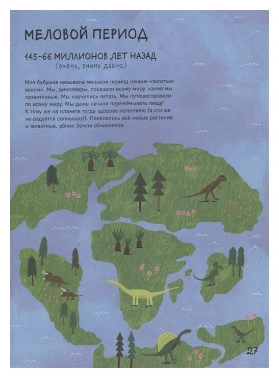 Про все основные известные виды динозавров есть энциклопедические факты, но изложены они очень смешно и весело, а не скучным сухим языком. Кто почему был с какими когтями, почему пришлось каким-то динозаврам научиться летать, а каким-то особенно быстро бегать.