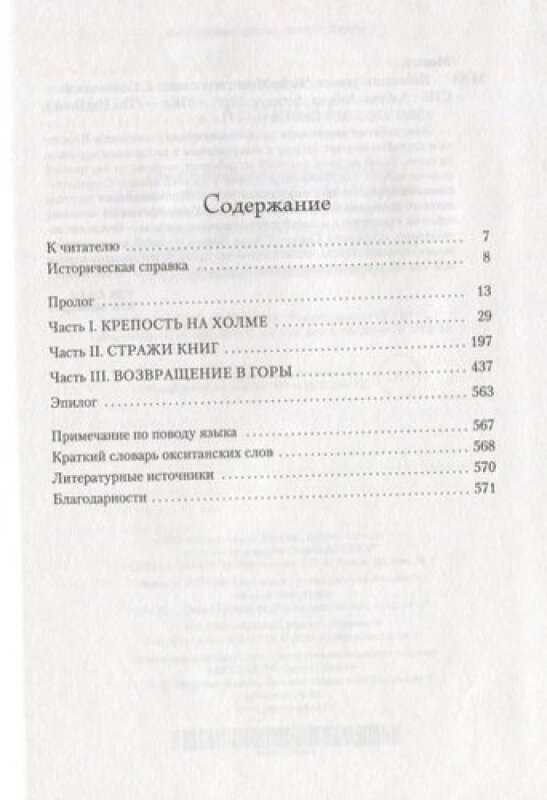 Мне понравилось! Действие разворачивается в наше время и в далёких 1200 годах во Франции. Судьбы героев из разных времен таинственным образом переплетены. Крестовый поход против катаров (я раньше о них и не слышала), история хранителей тайны Грааля, интриги, любовь. Все это описано хорошим языком, действие динамичное и захватывающее. Рекомендую! Небольшое разочарование принесло не до конца качественное полиграфическое исполнение обложки, а именно стирающаяся фольга, которой выполнено тиснение. Поэтому для сохранности издания советую обернуть книгу при прочтении.