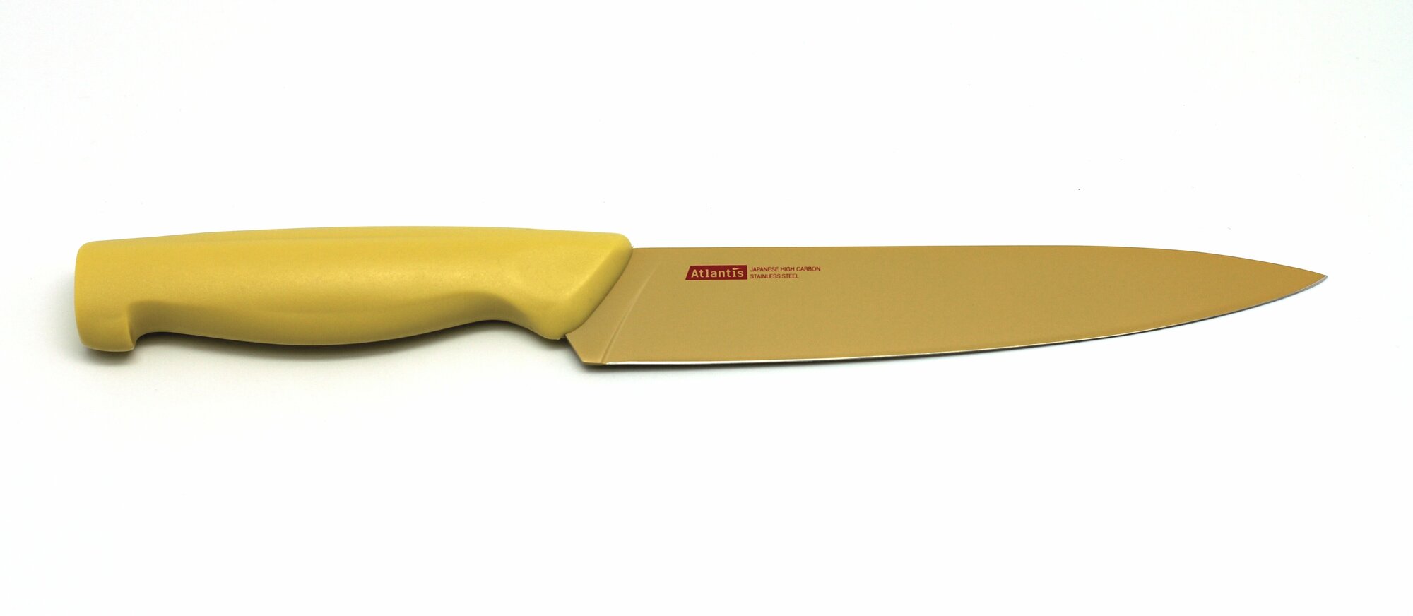 Нож для нарезки "Atlantis" изготовлен из японской высокоуглеродистой нержавеющей стали. Прочный и острый клинок обеспечивает идеальную нарезку мяса, овощей, сыра и других продуктов. Безопасное покрытие лезвия не дает пище прилипать к ножу. Эргономичная рукоятка изготовлена из пластика с антибактериальной защитой Microban, которая замедляет рост бактерий, вызывающих пятна и неприятный запах. Яркий дизайн, а также красивое сочетание желтых оттенков клинка и ручки добавит красок в интерьер вашей кухни. Характеристики: Материал: сталь, пластик. Цвет: желтый. Длина лезвия: 17,5 см. Общая длина ножа: 29,5 см. Артикул: 7S-Y.