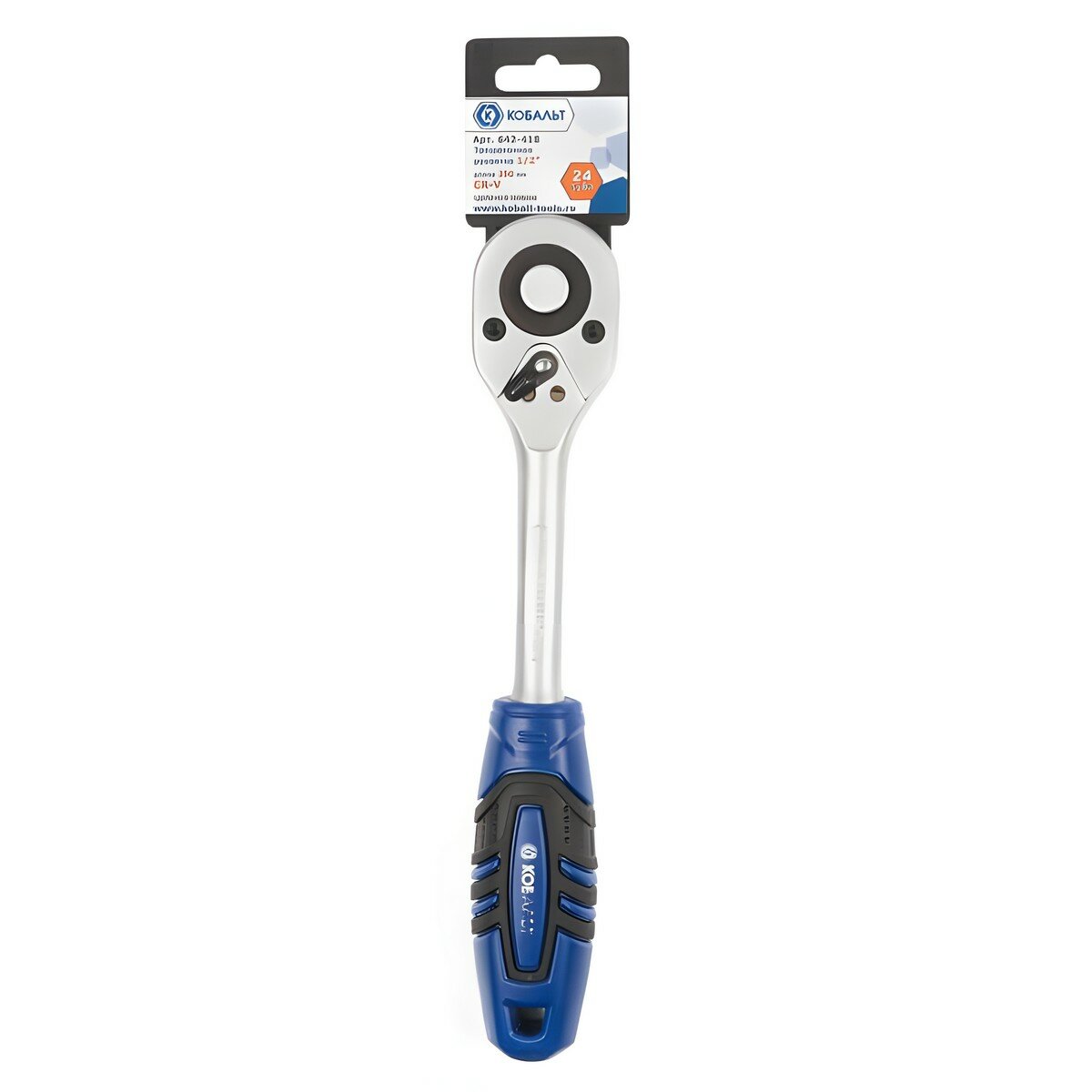 Трещоточная рукоятка прямая 250 мм КОБАЛЬТ предназначена для завинчивания/отвинчивания резьбового крепежа с помощью головок с приводным квадратом 1/2". Механическая часть изготовлена из хромванадиевой стали, имеет надежный храповой механизм 24 зуба, с одноступенчатым зацеплением большой площади. Наиболее хорошо подходит для работы в доступных местах, с минимальным уголом поворота 15о. Эргономичная двухкомпонентная (резина/пластик) рукоятка повышает комфортность работы. Прямая форма рукояти позволяет наиболее хорошо передавать крутящий момент, что особенно важно при использовании в автосервисах во время ремонта различных механизмов и агрегатов, чьи крепежные элементы имеют тугое вращение. Удобная кнопка фиксации головки и флажковый переключатель направления вращения повышают скорость работы. Рекомендована для головок с размерами 10-32 мм. Запрещается использовать для непосредственного затягивания или отворачивания сильно затянутого крепежа, для затягивания или страгивания необходимо использовать вороток.