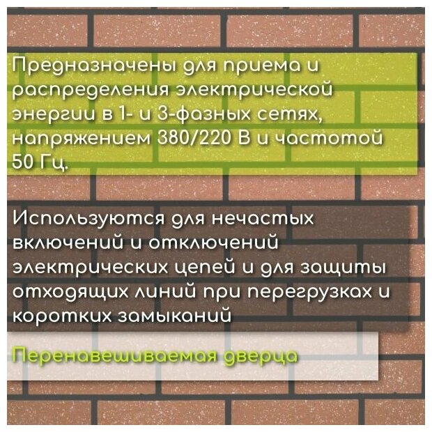 Назначение:_x000D_Предназначены для приема и распределения электрической энергии в 1- и 3-фазных сетях, напряжением 380/220 В и частотой 50 Гц.