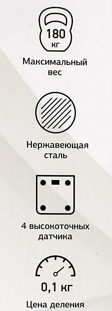 | Прочие особенности и свойства | Измерение в килограммах, в фунтах, Индикатор заряда батареи, Материал платформы нержавеющая сталь, Индикатор перегрузки |