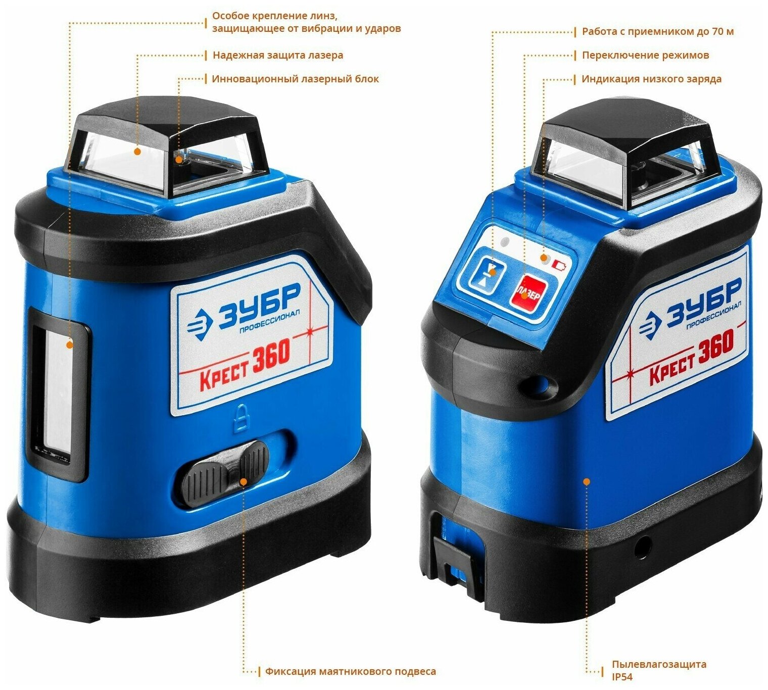 Строит 2 плоскости: горизонтальную 360° и вертикальную. 4 режима работы (включая режимы раздельного проецирования линий). Может работать с детектором (в таком случает рабочее расстояние увеличивается с 20 до 70 метров, детектор приобретается отдельно). Высокая точность ±0.3 мм/м обеспечивает максимально качественный результат. Ширина лазерной линии составляет ~2 мм. Присутствует функция автоматического выравнивания, благодаря которой отсутствует необходимость в точной настройке. При превышении угла самовыравнивания (±4°) проецируемые линии начнут мигать. Возможна работа под наклоном при фиксации маятникового подвеса.