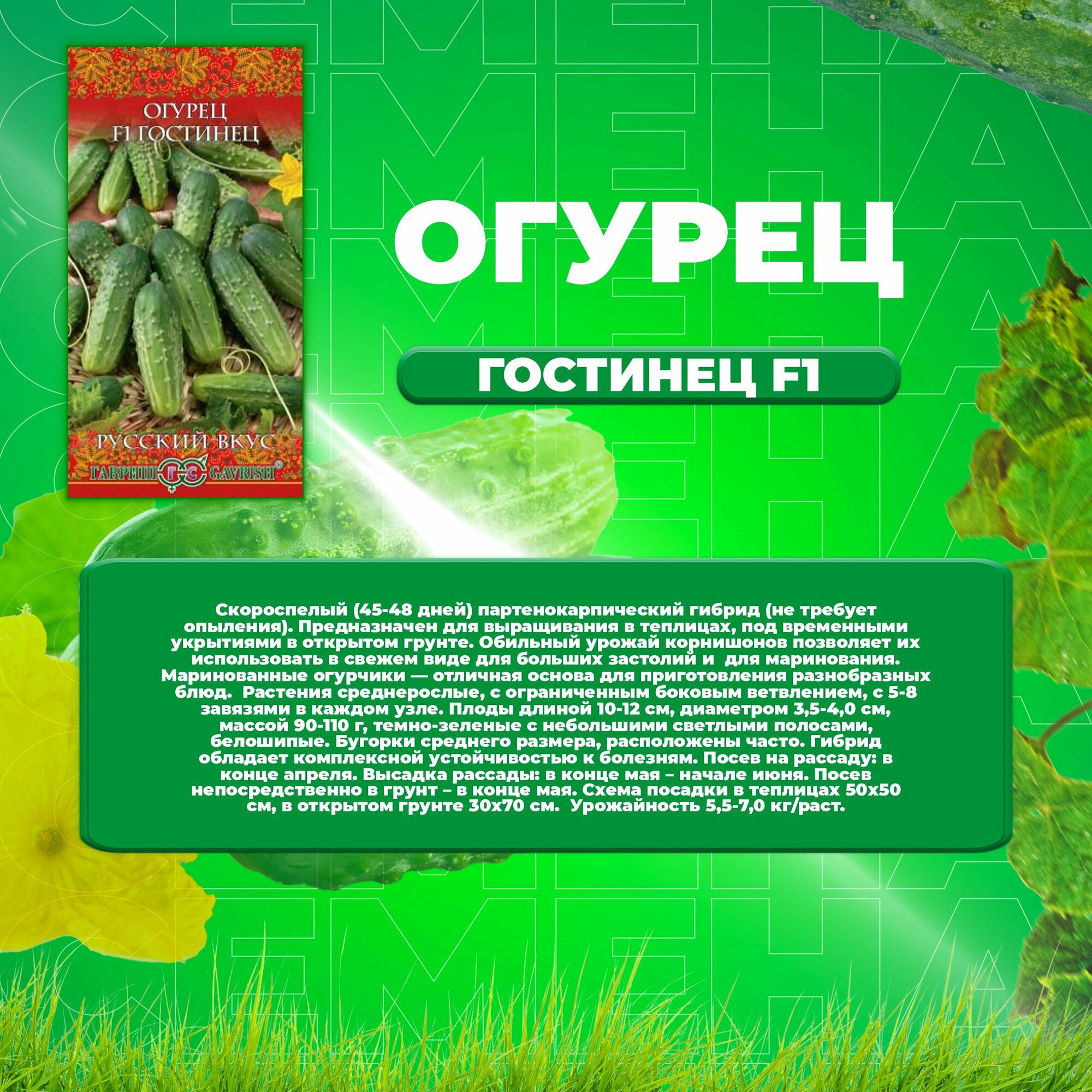 Скороспелый (45-48 дней) партенокарпический гибрид (не требует опыления). Предназначен для выращивания в теплицах, под временными укрытиями в открытом грунте. Обильный урожай корнишонов позволяет их использовать в свежем виде для больших застолий и для маринования. Маринованные огурчики - отличная основа для приготовления разнобразных блюд. Растения среднерослые, с ограниченным боковым ветвлением, с 5-8 завязями в каждом узле. Плоды длиной 10-12 см, диаметром 3,5-4,0 см, массой 90-110 г, темно-зеленые с небольшими светлыми полосами, белошипые. Бугорки среднего размера, расположены часто. Гибрид обладает комплексной устойчивостью к болезням. Посев на рассаду: в конце апреля. Высадка рассады: в конце мая - начале июня. Посев непосредственно в грунт - в конце мая. Схема посадки в теплицах 50х50 см, в открытом грунте 30х70 см. Урожайность 5,5-7,0 кг/раст.
