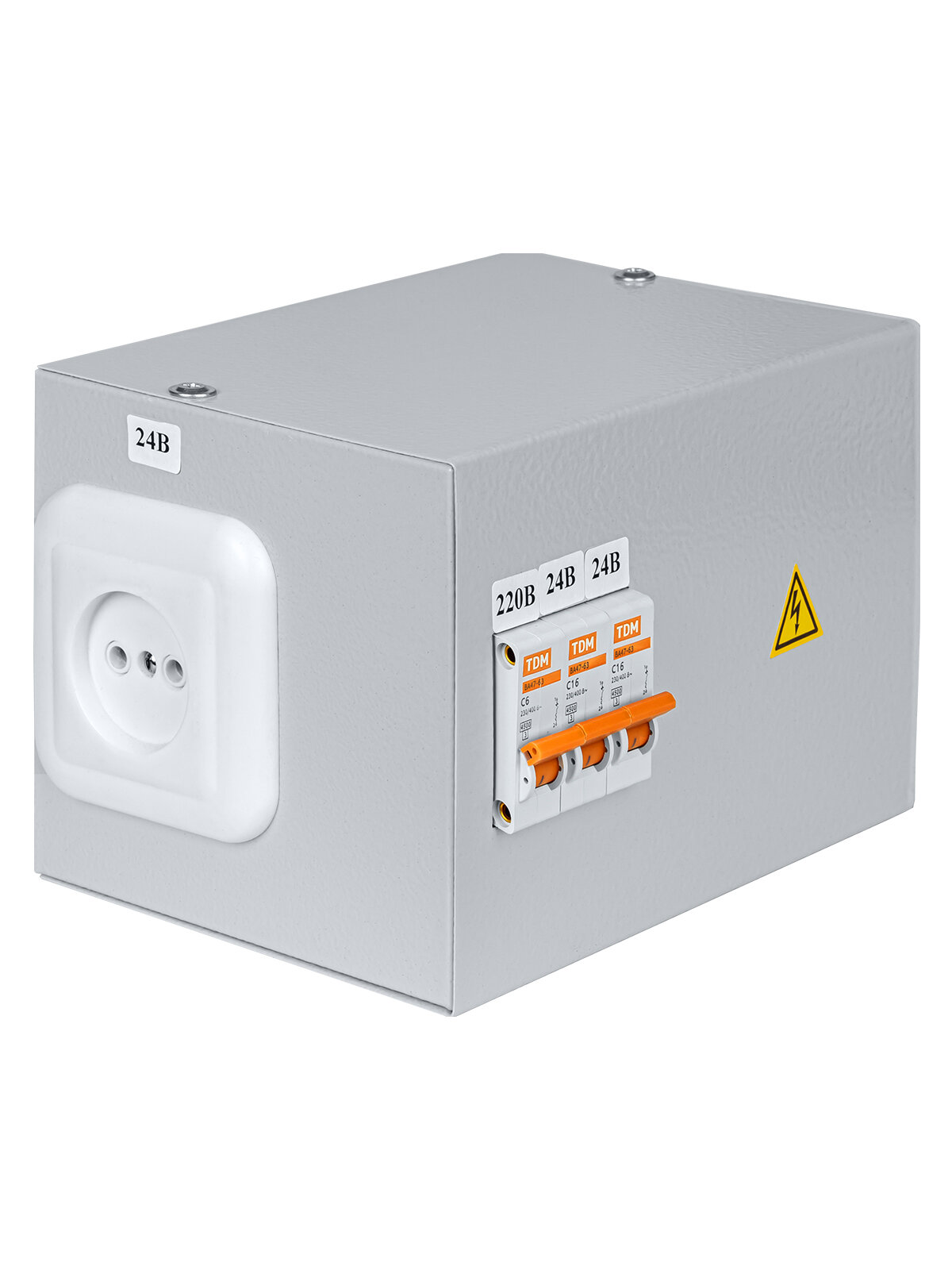 ЯТП-0,25 220/24-3авт. TDM SQ1601-0004МатериалыКорпус — сертифицированная российская сталь (ГОСТ).Покрытие корпуса — текстурированный полиэстеровый порошок.КонструкцияМеталлический корпус.Понижающий трансформатор типа ОСО-0,25, 0,4.Автоматические выключатели ВА47.Розетка (для IP31).ПреимуществаКомпактные размеры корпуса.Удобство подключения и использования.Высокий уровень электробезопасности.Высококачественное порошковое покрытие.Условные обозначенияЯТП-0,25 220/12 2авт. Я — ящик Т — с трансформатором П — понижающим 0,25 — номинальная мощность трансформатора типа осо, Вт 220 — напряжение первичной обмотки, В 12 — напряжение вторичной обмотки, В (12В, 24В, 36В, 42В) 2авт. — количество автоматических выключателей (2, 3 шт)НазначениеПитание цепей местного или ремонтного освещения.Подключение инструментов и переносных светильников.ПрименениеВ промышленном секторе.В строительстве.