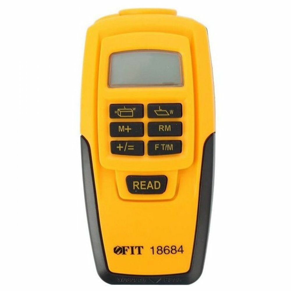 FIT — ультразвуковой дальномер с лазерной указкой для расчета площади и измерения расстояния. Модель с функциями автовыключения, вычисления объема и площади, а также запоминания и накопления данных. Рабочий диапазон прибора — от 0,6 до 15 м.