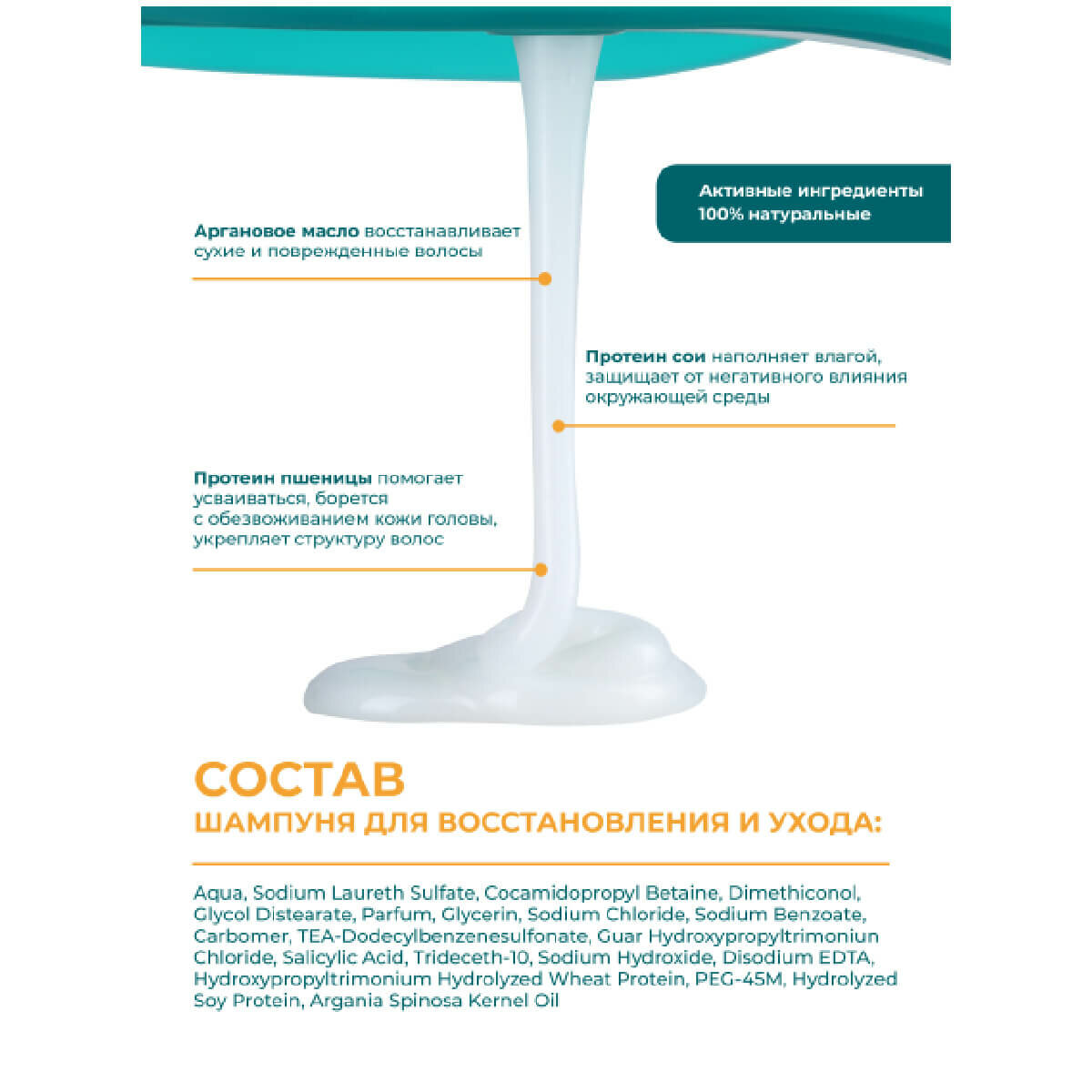 | Состав | Aqua, Sodium Laureth Sulfate, Cocamidopropyl Betaine, Dimethiconol, Glycol Distearate, Parfum, Glycerin, Sodium Chloride, Sodium Benzoate, Carbomer, TEA-Dodecylbenzenesulfonate, Guar Hydroxypropyltrimoniun Chloride, Salicylic Acid, Trideceth-10, Sodium Hydroxide, Disodium EDTA, Hydroxypropyltrimonium Hydrolyzed Wheat Protein, PEG-45M, Hydrolyzed Soy Protein, Argania Spinosa Kernel Oil |