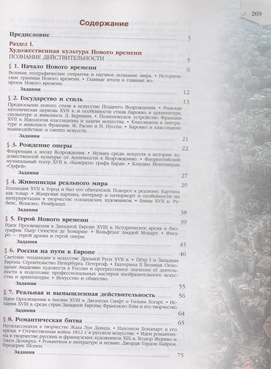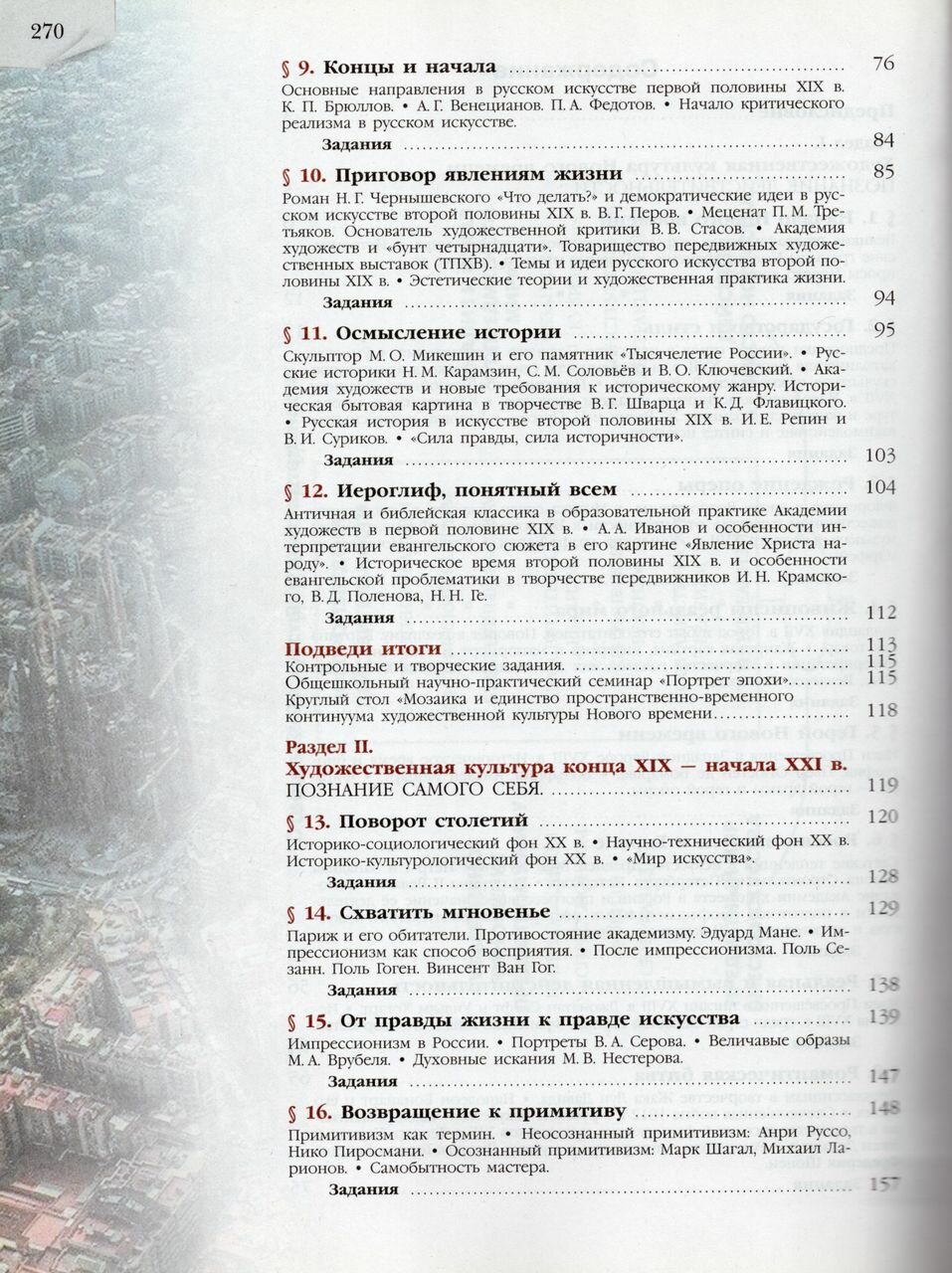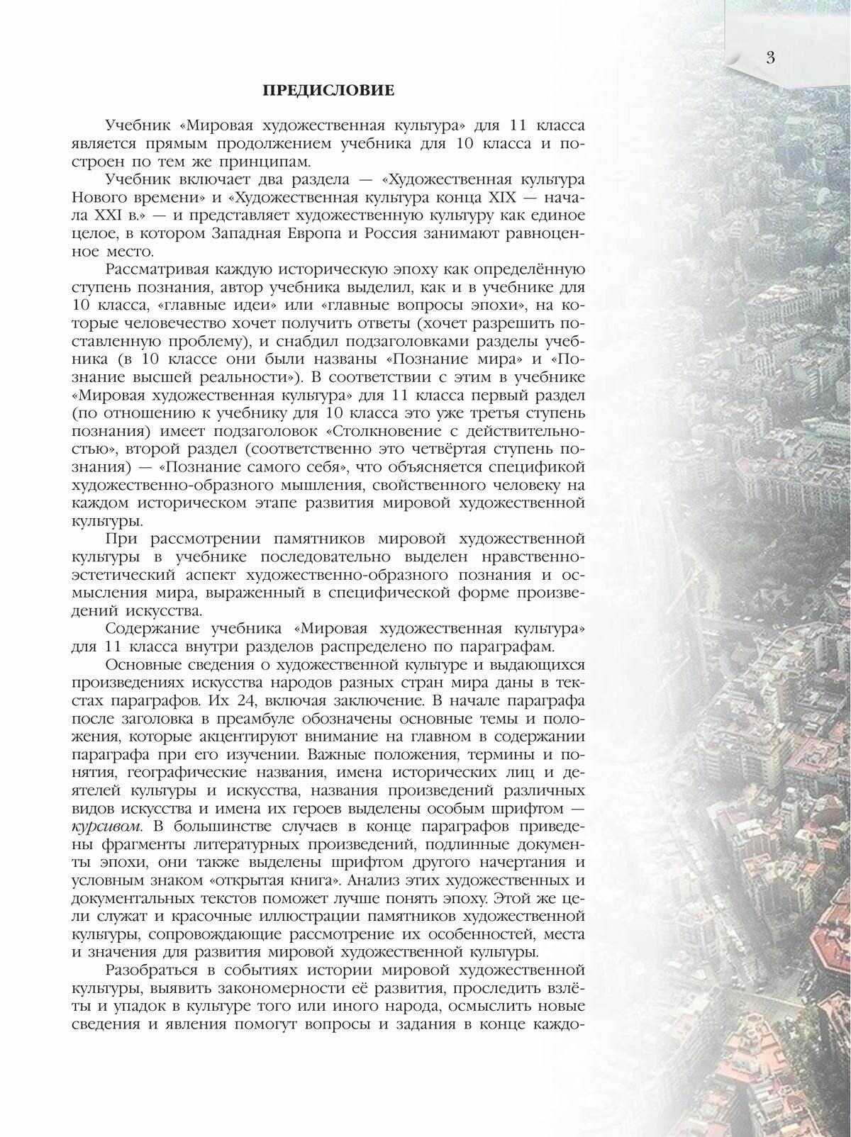 Учебник даёт представление об особенностях развития мировой художественной культуры Нового и Новейшего времени, включает сведения о достижениях школ национального искусства в странах Западной Европы, России и других странах мира и объясняет, что благодаря интенсивному культурному обмену, тесной связи искусства с общественными и духов-ными проблемами времени искусство XIX-XX вв. становится единой и в то же время чрезвычайно разнообразной картиной-панорамой. В учебнике центральное место занимает выявление сходства и различий в художественно-образном строе произведений искусства и отображение в них картины мира, духовно-нравственных исканий и общечеловеческих ценностей и идеалов человека конкретной эпохи. Соответственно требованиям ФГОС среднего (полного) общего образования учебник содержит вариативные задания для самостоятельной работы учащихся, ориентирующие на использование компьютерных технологий, закладывающие основы реализации проектно-исследовательской деятельности, а также помогающие организовать и планировать учебное сотрудничество и согласованное взаимодействие участников. Учебник включает опорные наглядные конспекты и справочные материалы.