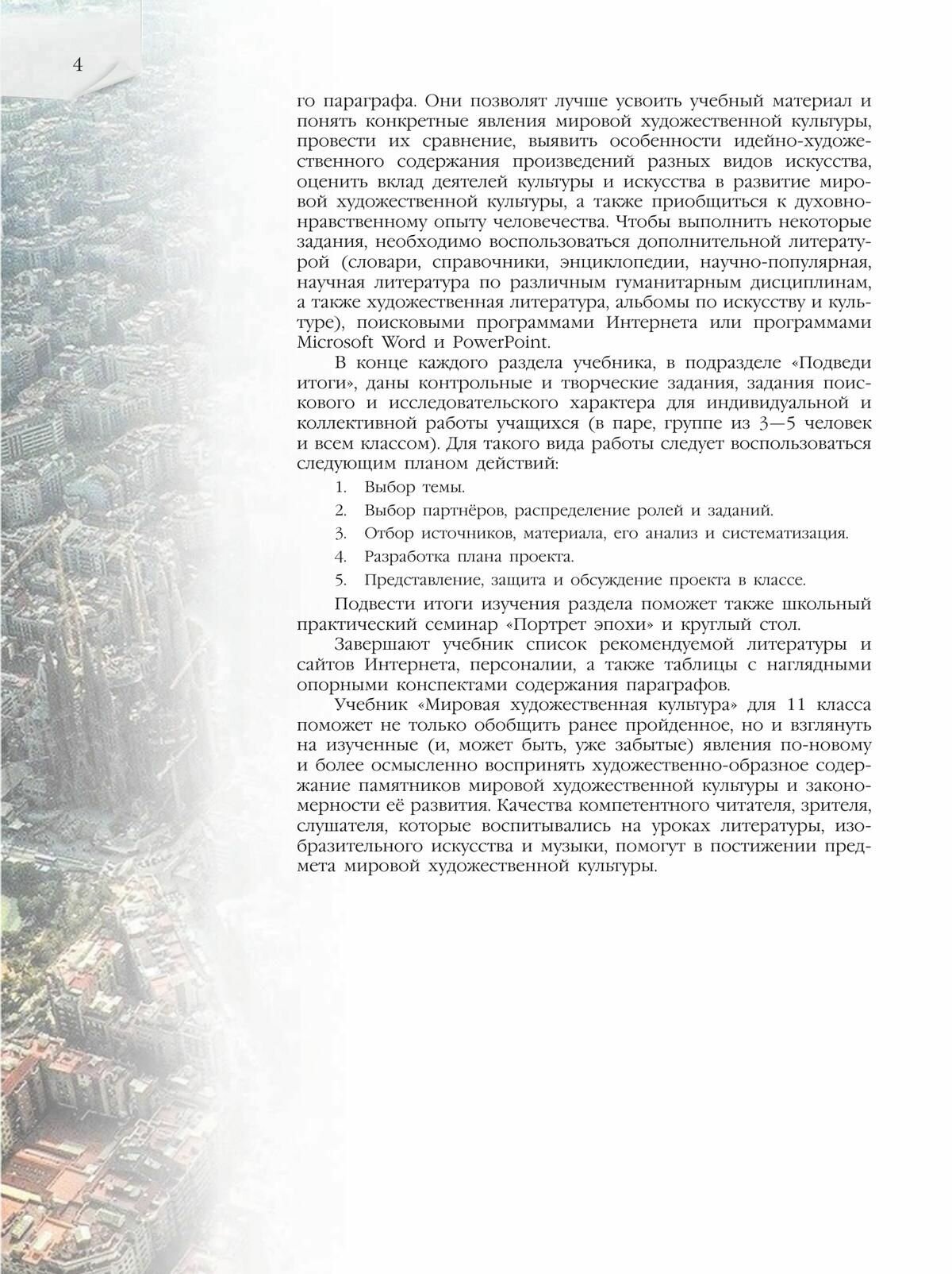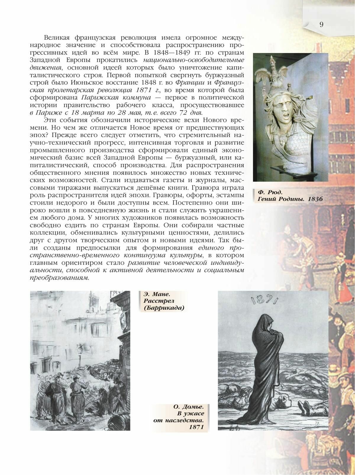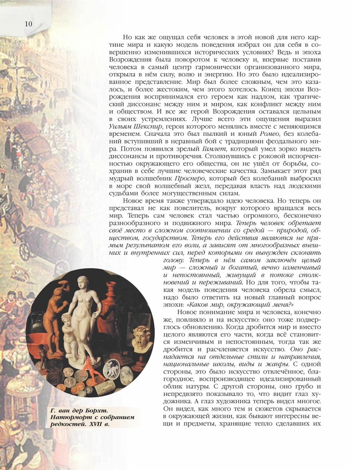 Учебник даёт представление об особенностях развития мировой художественной культуры Нового и Новейшего времени, включает сведения о достижениях школ национального искусства в странах Западной Европы, России и других странах мира и объясняет, что благодаря интенсивному культурному обмену, тесной связи искусства с общественными и духов-ными проблемами времени искусство XIX-XX вв. становится единой и в то же время чрезвычайно разнообразной картиной-панорамой. В учебнике центральное место занимает выявление сходства и различий в художественно-образном строе произведений искусства и отображение в них картины мира, духовно-нравственных исканий и общечеловеческих ценностей и идеалов человека конкретной эпохи. Соответственно требованиям ФГОС среднего (полного) общего образования учебник содержит вариативные задания для самостоятельной работы учащихся, ориентирующие на использование компьютерных технологий, закладывающие основы реализации проектно-исследовательской деятельности, а также помогающие организовать и планировать учебное сотрудничество и согласованное взаимодействие участников. Учебник включает опорные наглядные конспекты и справочные материалы.