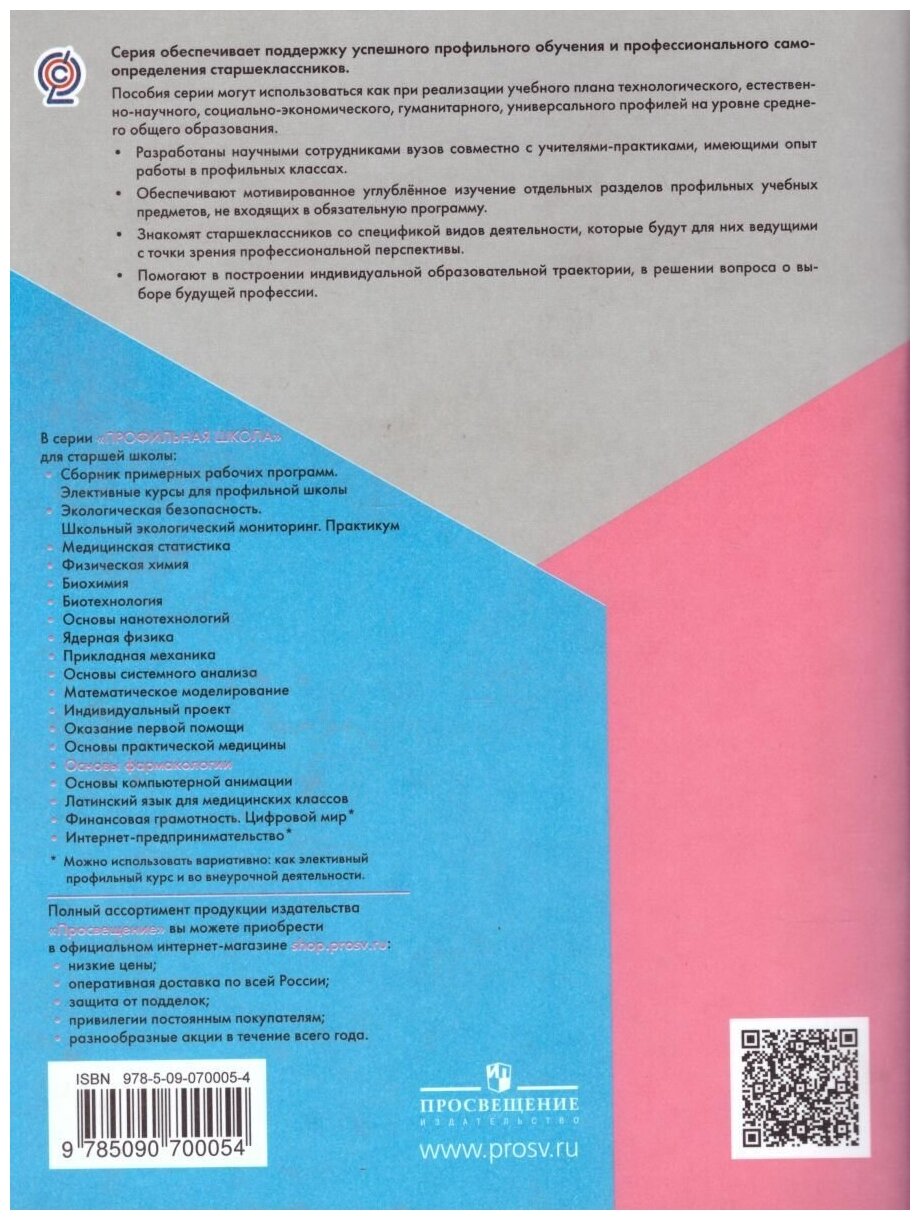 Учебное пособие из серии "Профильная школа" предназначено для изучения элективного курса общей фармакологии в объёме 35 учебных часов в рамках естественно-научного и универсального профилей обучения на уровне среднего общего образования. В ходе изучения курса учащиеся 10-11-х классов познакомятся с историей фармакологии, основами фармакокинетики и фармакодинамики, с задачами фармакотерапии в лечении и профилактике заболеваний. Пособие знакомит учащихся с номенклатурой, терминологией и классификацией лекарственных средств, принципами выписывания рецептов.