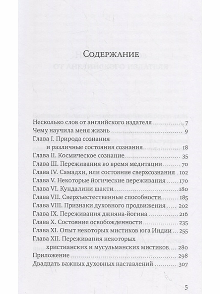 Тема этой книги - природа сознания и состояния сознания. В ней даны описания различных переживаний на духовном пути, этапы опыта самадхи и разновидности этого опыта, достигаемые через различные пути духовной практики, а также сверхъестественных сил, которые обретает йогин, приводятся основные характеристики духовного продвижения.