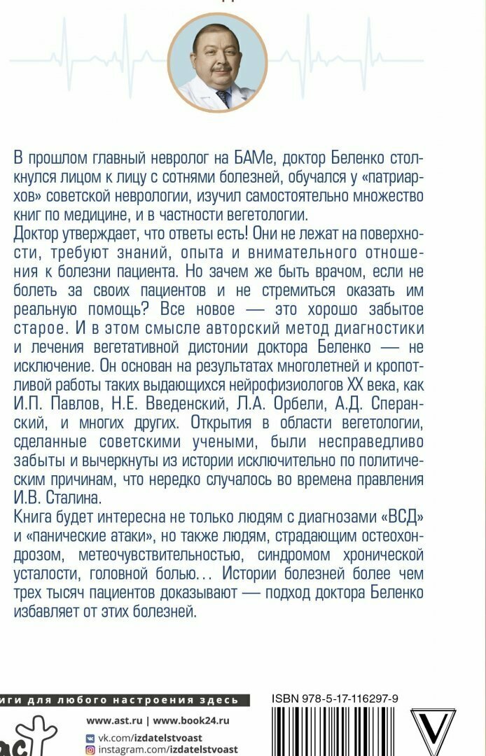 Книга будет интересна не только людям с диагнозами "ВСД" и "панические атаки", но также людям, страдающим остеохондрозом, метеочувствительностью, синдромом хронической усталости, головной болью… Истории болезней более чем трех тысяч пациентов доказывают - подход доктора Беленко избавляет от этих болезней.