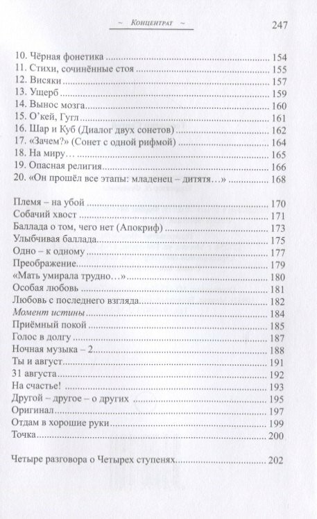 В новую книгу вошли стихи последних трех лет. Размышления поэта о мире, о месте человека в нём сконцентрированы не только в стихах, но и в духовных беседах с другом. Четыре ступени, преодоление их - путь человеческой души - наполняет книгу особенной глубиной и светом.