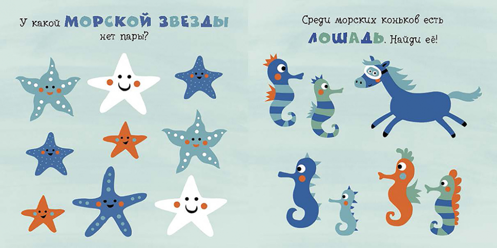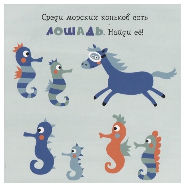 Разве у морских коньков бывают копыта? А среди стаи моржей, кажется, спрятался тюлень! В этой яркой книге для детей от 2 лет малышей ждет очень много интересных заданий. Сможет ли маленький читатель найти все отличия?
