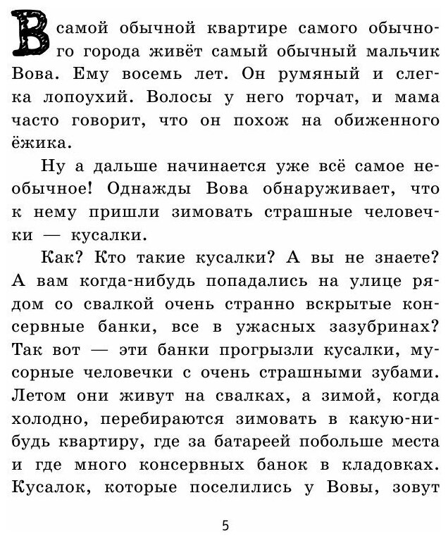 Чудеса происходят не каждый день, но если уж начинают случаться, то их уже не остановишь. Вот и у Вовы произошло не одно, а сразу несколько удивительных событий! Сначала он познакомился с крошечной девочкой-куклой Дашей, затем узнал, что в его аквариуме живет самый настоящий водяной Буль-бульчик. А ещё в его комнате за батареей поселились забавные человечки — кусалки. И не просто поселились, а стали вовсю хозяйничать. То съедят все консервы, то стащат у водяного волшебную книгу… И ведь никак их не угомонишь! Как же Вове справиться с проказливыми человечками? Может, кукла Даша и водяной Буль-бульчик помогут ему в этом?