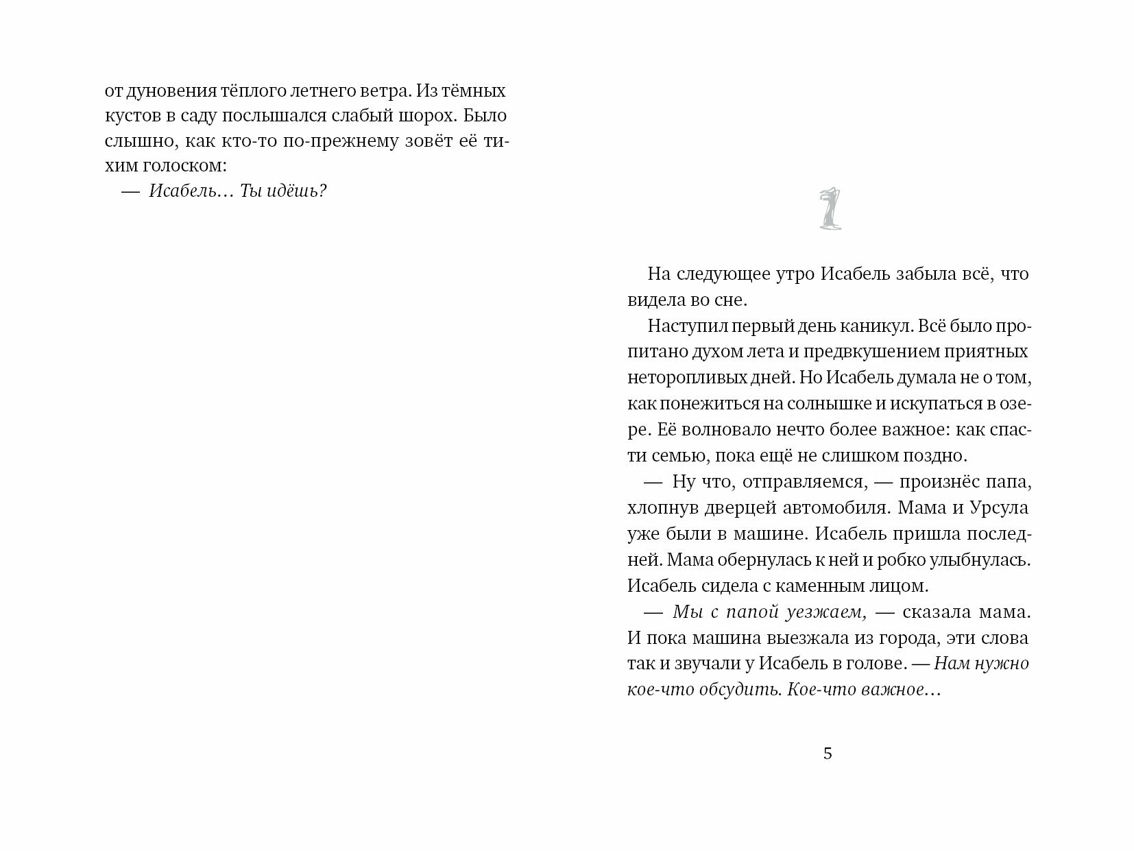 Но в этой беззаботности сквозит тревога. Исабель ощущает чьё-то незримое присутствие, слышит мольбы о помощи — и не может их игнорировать. Странные сны, запертая дверь в подвал, вырезанные на дереве инициалы, старые фотографии и тайник в гроте у лесного озера в конце концов должны сложиться в картину, которая станет ключом к прошлому и дорогой в будущее.